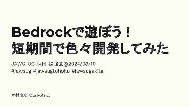 JAWS-UG 秋田 勉強会@2024/08/10 #jawsug #jawsugtohoku #jawsugakita 木村俊彦 @taiko19xx Bedrockで遊ぼう! 短期間で色々開発してみた