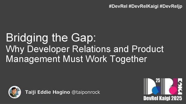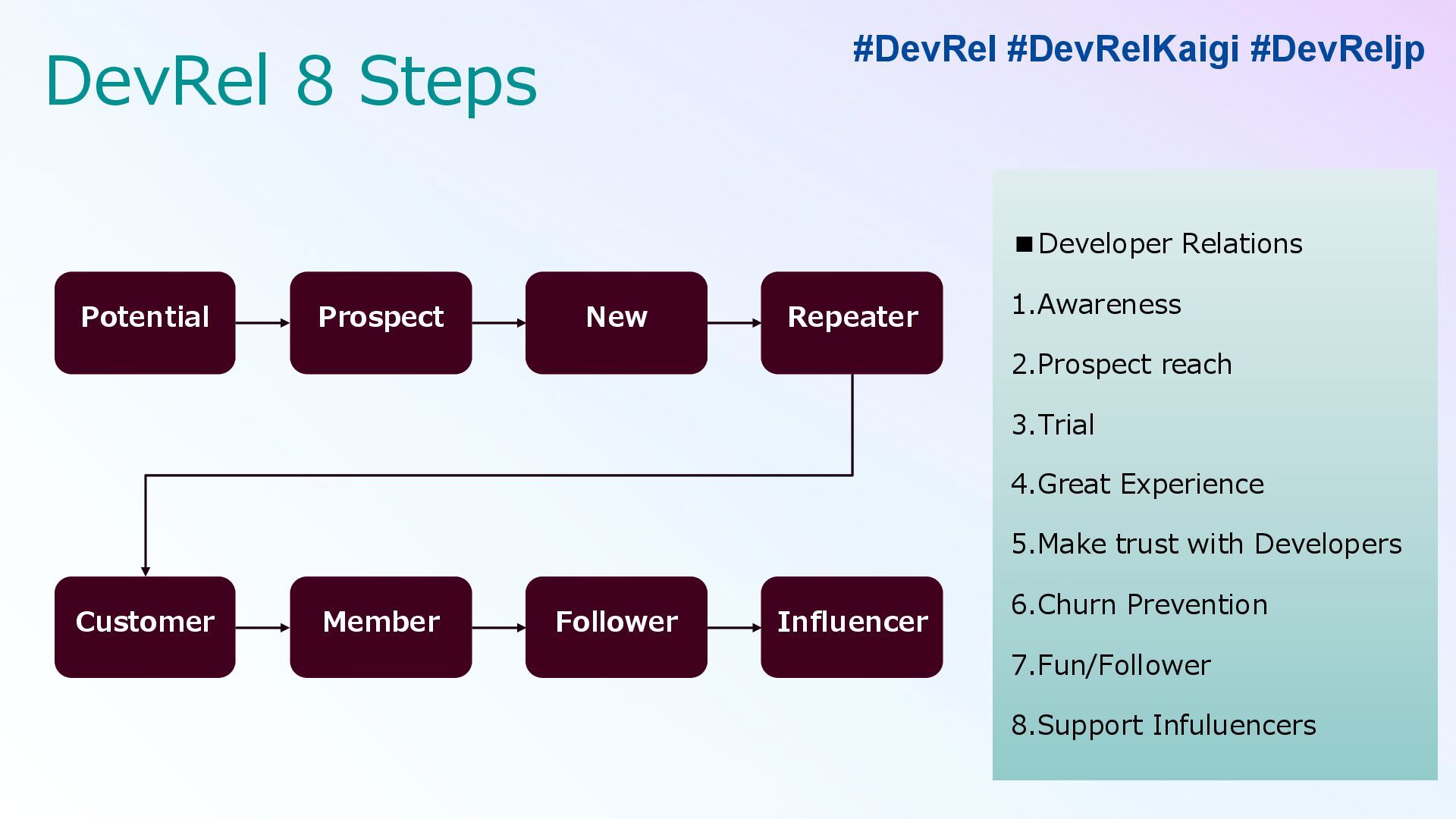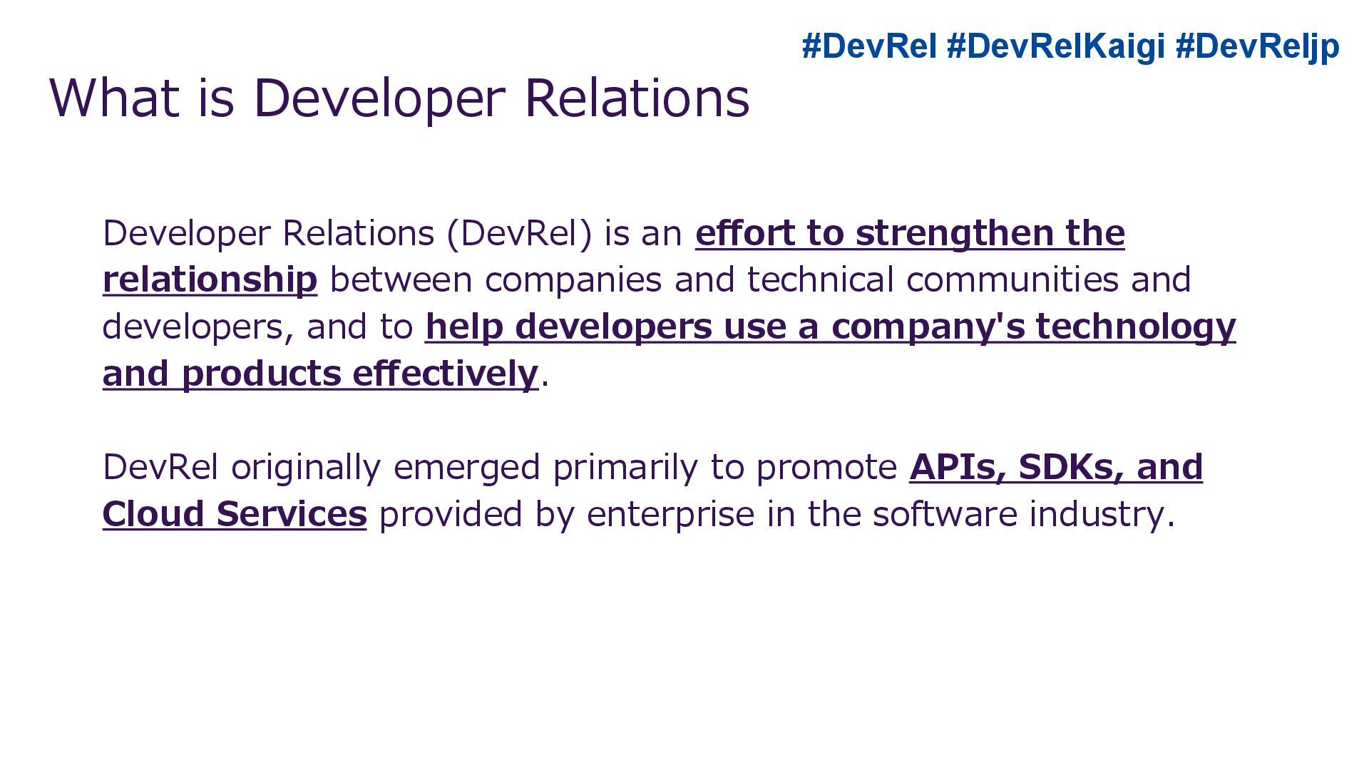 between companies and technical communities and developers, and to help developers use a company's technology and products effectively. DevRel originally emerged primarily to promote APIs, SDKs, and Cloud Services provided by enterprise in the software industry. What is Developer Relations #DevRel #DevRelKaigi #DevReljp