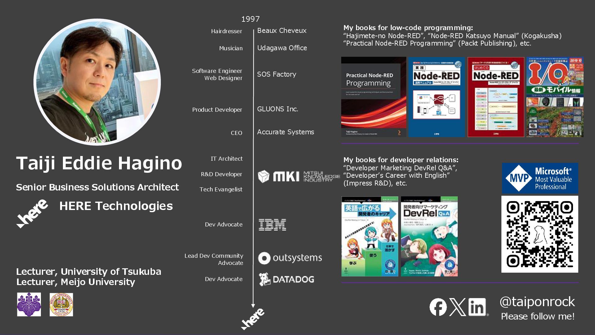 Tsukuba Lecturer, Meijo University Senior Business Solutions Architect My books for low-code programming: “Hajimete-no Node-RED”, “Node-RED Katsuyo Manual” (Kogakusha) “Practical Node-RED Programming” (Packt Publishing), etc. My books for developer relations: “Developer Marketing DevRel Q&A”, “Developer’s Career with English” (Impress R&D), etc. Hairdresser Musician Software Engineer Web Designer Product Developer R&D Developer IT Architect Tech Evangelist Dev Advocate Lead Dev Community Advocate 1997 GLUONS Inc. CEO Accurate Systems SOS Factory Udagawa Office Beaux Cheveux Dev Advocate HERE Technologies
