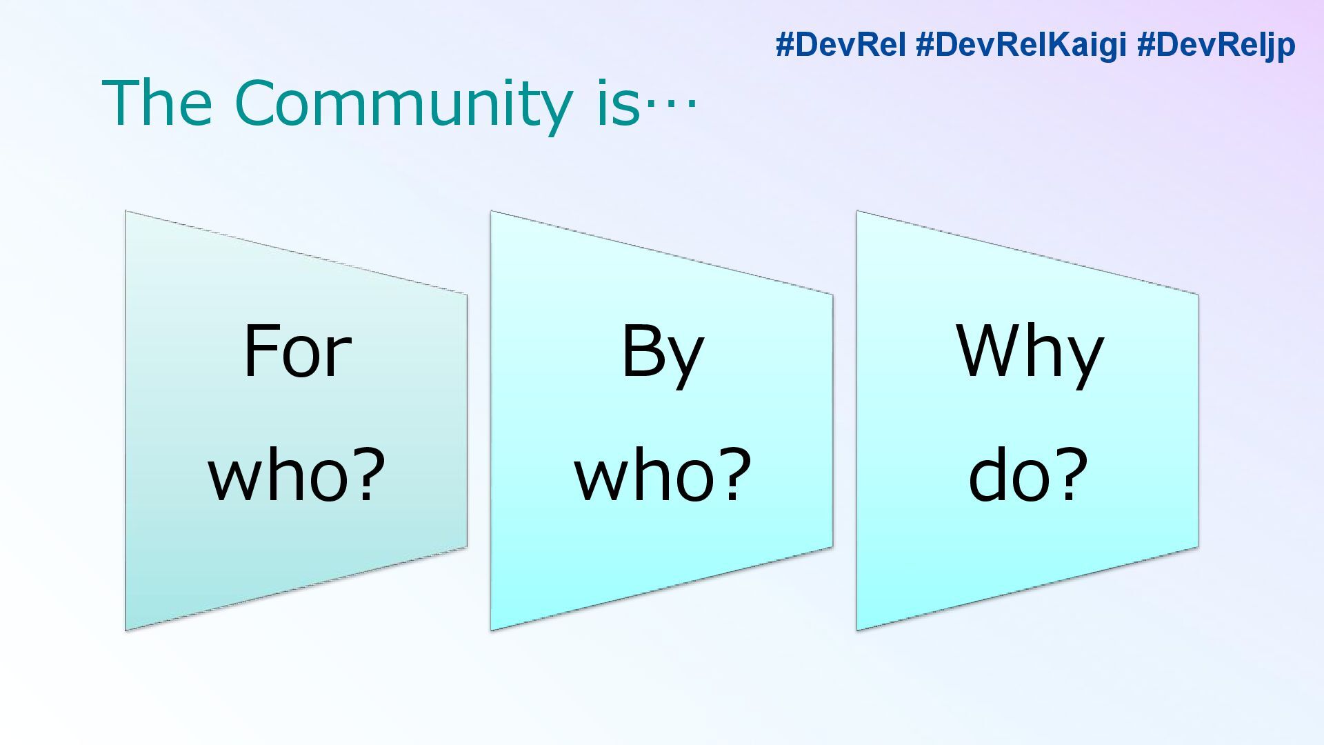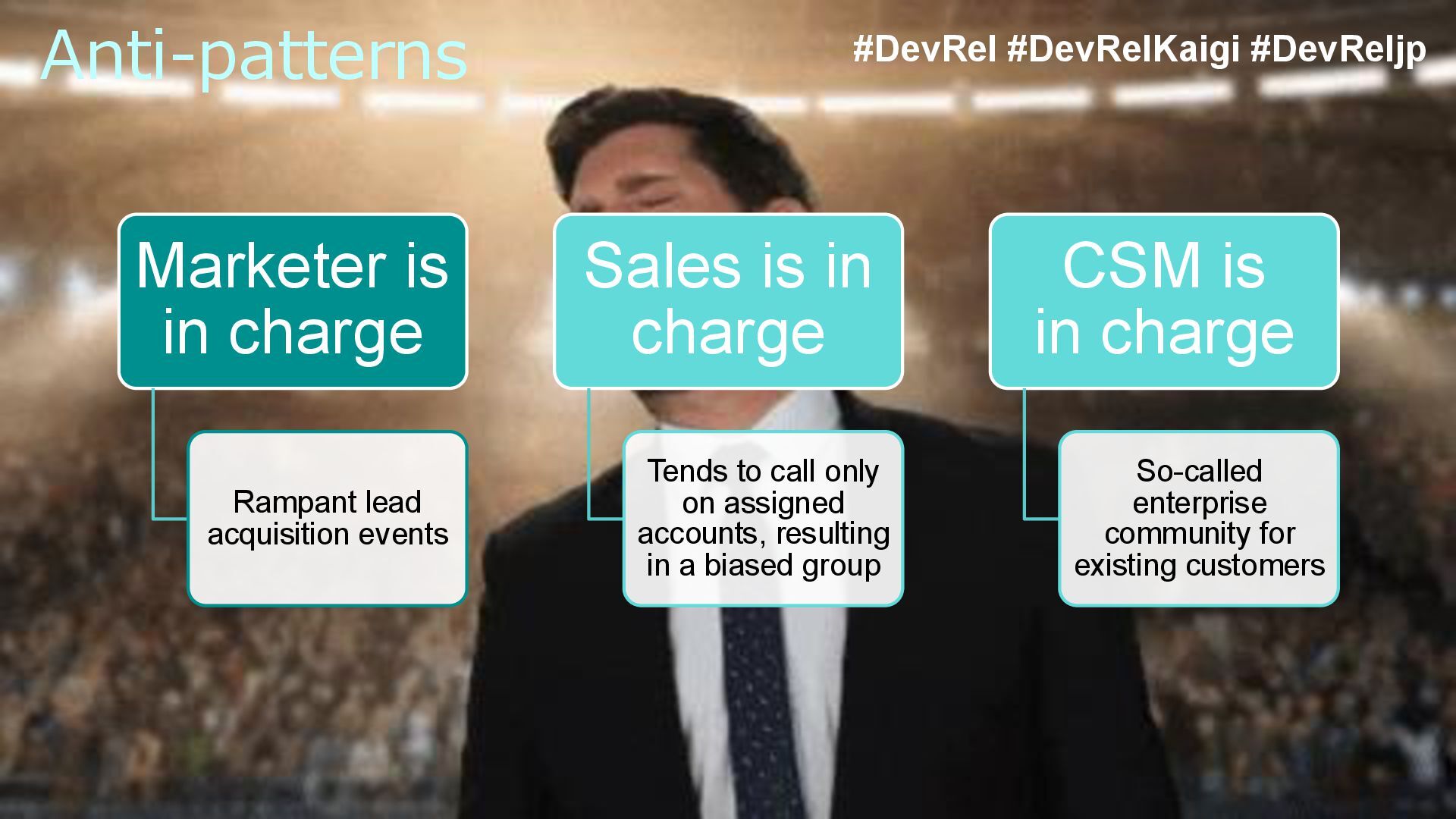 in charge Tends to call only on assigned accounts, resulting in a biased group CSM is in charge So-called enterprise community for existing customers Anti-patterns #DevRel #DevRelKaigi #DevReljp