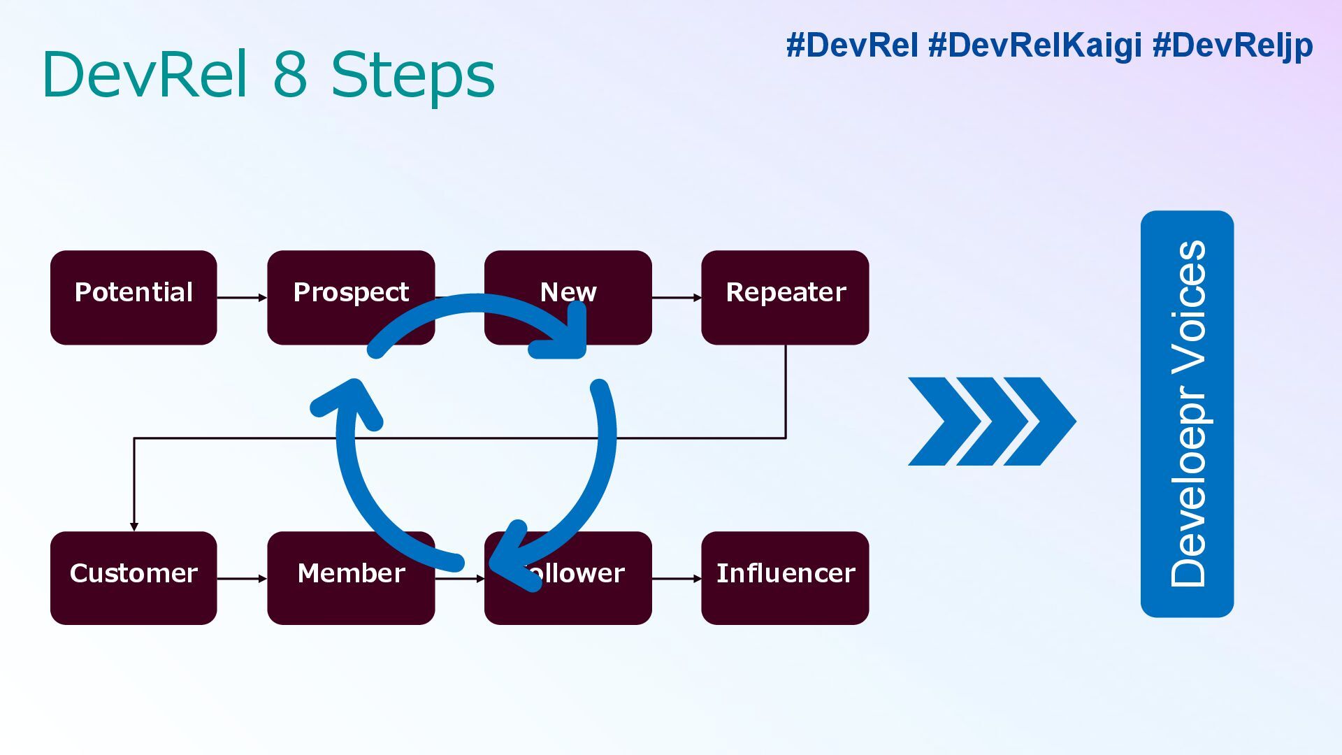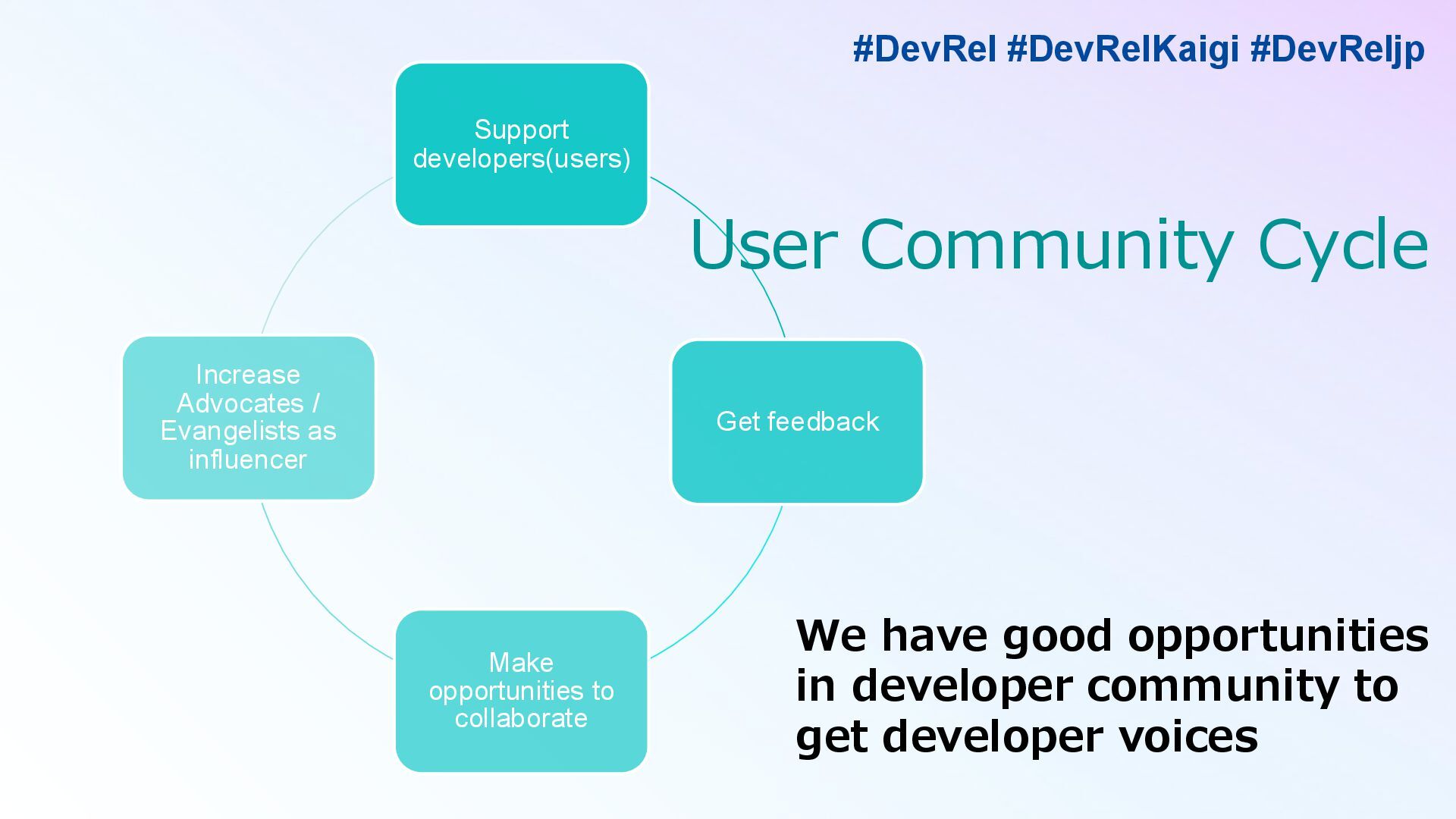 / Evangelists as influencer We have good opportunities in developer community to get developer voices User Community Cycle #DevRel #DevRelKaigi #DevReljp