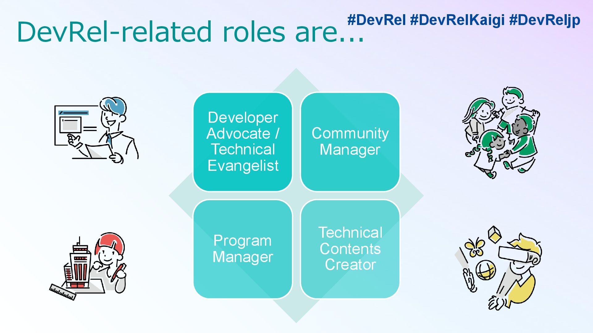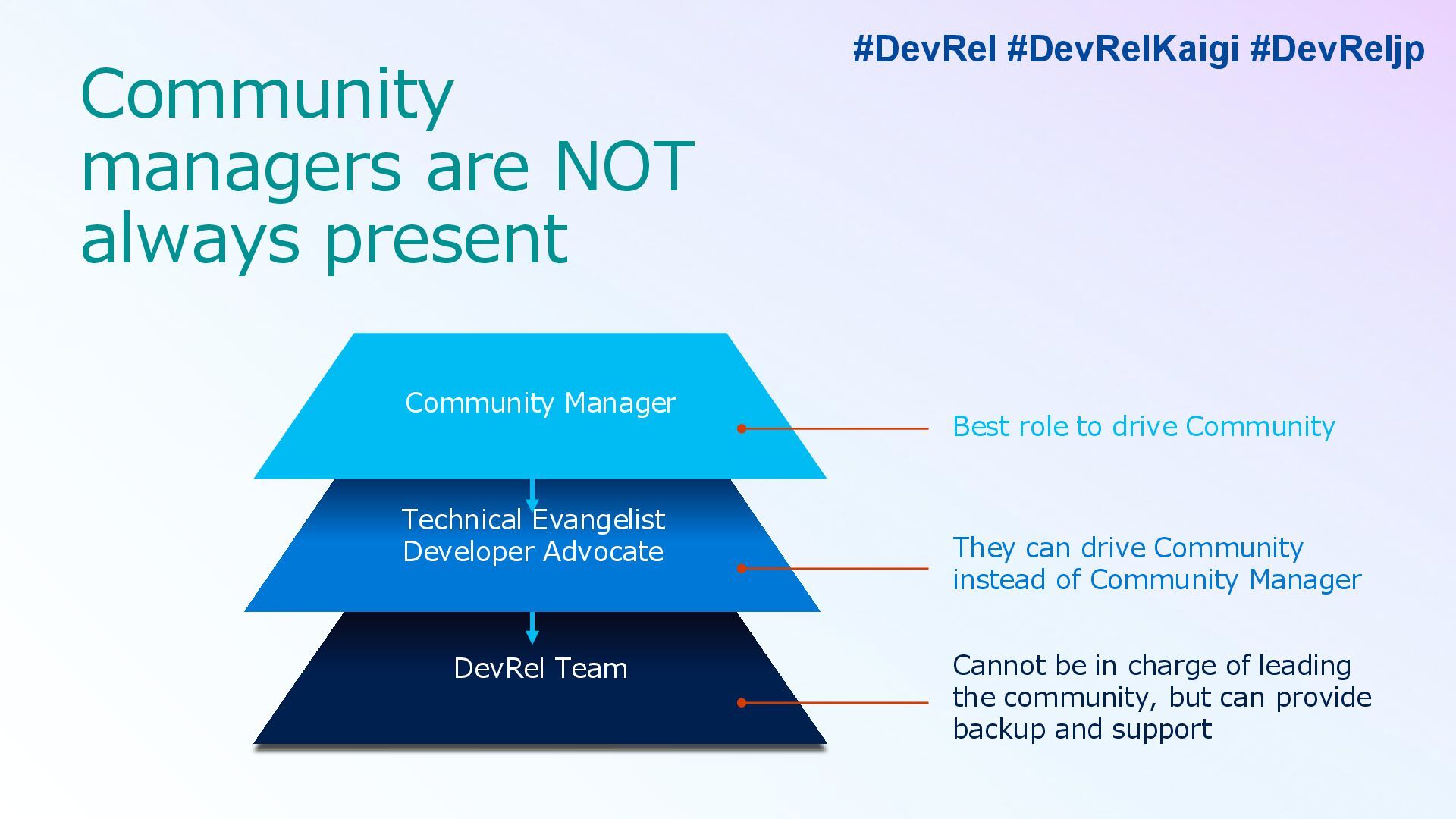 Developer Advocate Community Manager They can drive Community instead of Community Manager Best role to drive Community Cannot be in charge of leading the community, but can provide backup and support #DevRel #DevRelKaigi #DevReljp