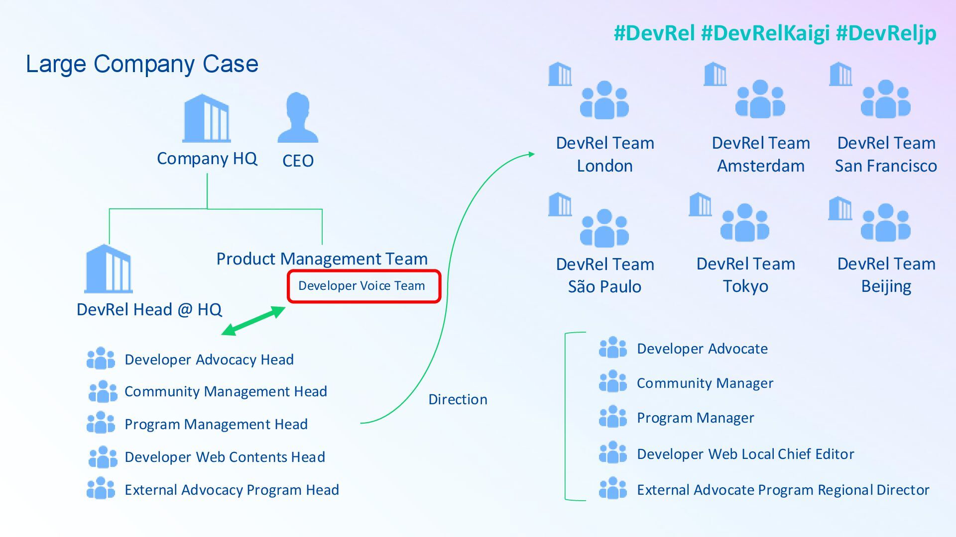 DevRel Team Tokyo DevRel Team Amsterdam DevRel Team São Paulo Developer Advocacy Head Community Management Head DevRel Team Beijing Developer Advocate Community Manager Program Manager Developer Web Local Chief Editor External Advocate Program Regional Director Direction DevRel Team San Francisco Program Management Head Developer Web Contents Head External Advocacy Program Head Company HQ CEO Product Management Team Developer Voice Team #DevRel #DevRelKaigi #DevReljp