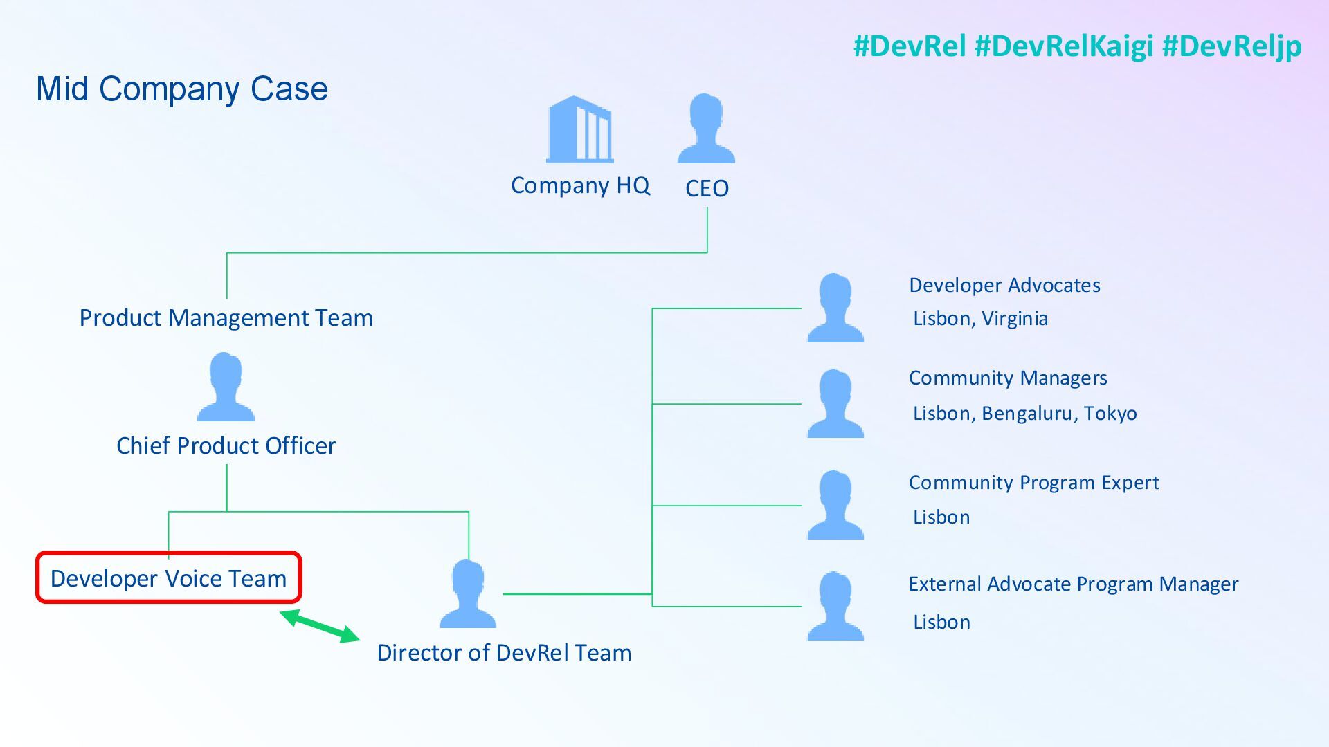 Virginia Company HQ CEO Product Management Team Chief Product Officer Director of DevRel Team Community Managers Community Program Expert Lisbon, Bengaluru, Tokyo Lisbon Lisbon Developer Voice Team #DevRel #DevRelKaigi #DevReljp