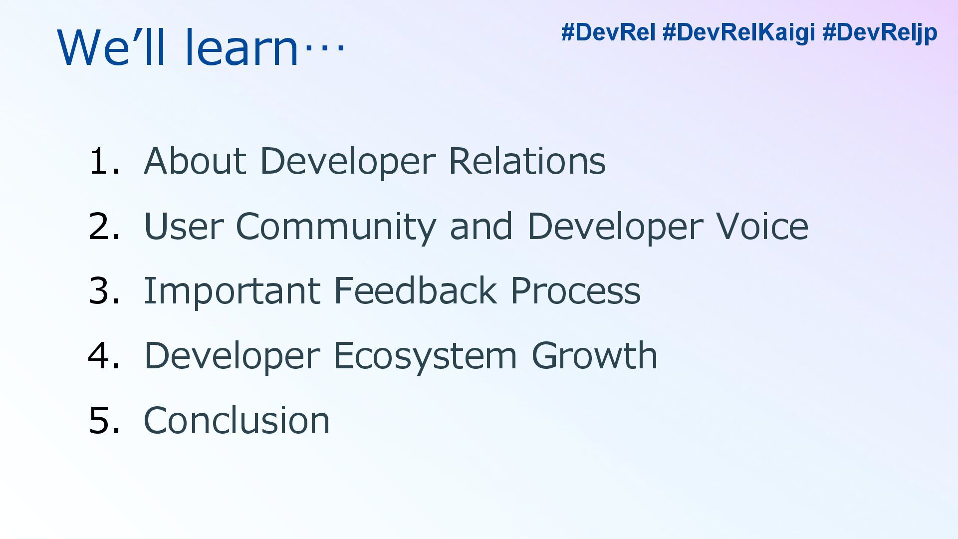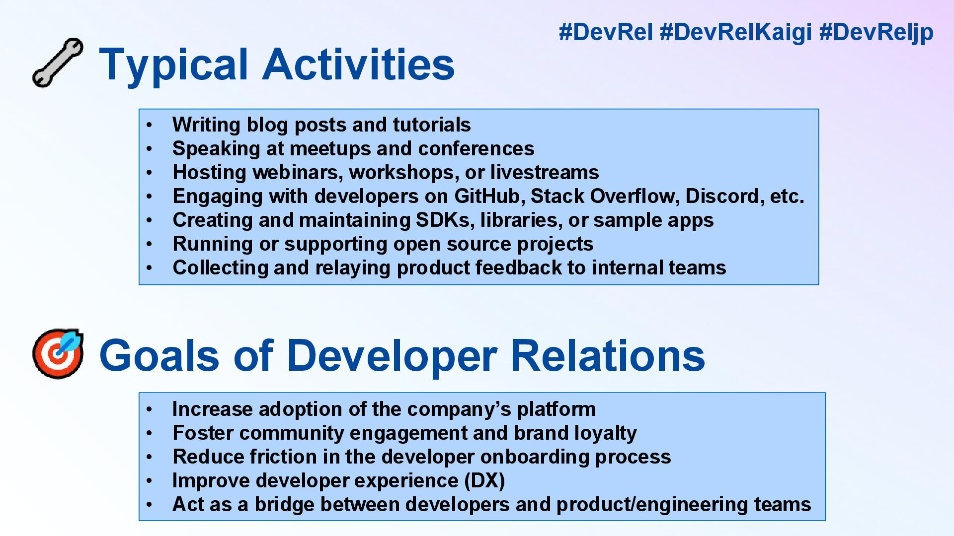 at meetups and conferences • Hosting webinars, workshops, or livestreams • Engaging with developers on GitHub, Stack Overflow, Discord, etc. • Creating and maintaining SDKs, libraries, or sample apps • Running or supporting open source projects • Collecting and relaying product feedback to internal teams Goals of Developer Relations • Increase adoption of the company’s platform • Foster community engagement and brand loyalty • Reduce friction in the developer onboarding process • Improve developer experience (DX) • Act as a bridge between developers and product/engineering teams #DevRel #DevRelKaigi #DevReljp