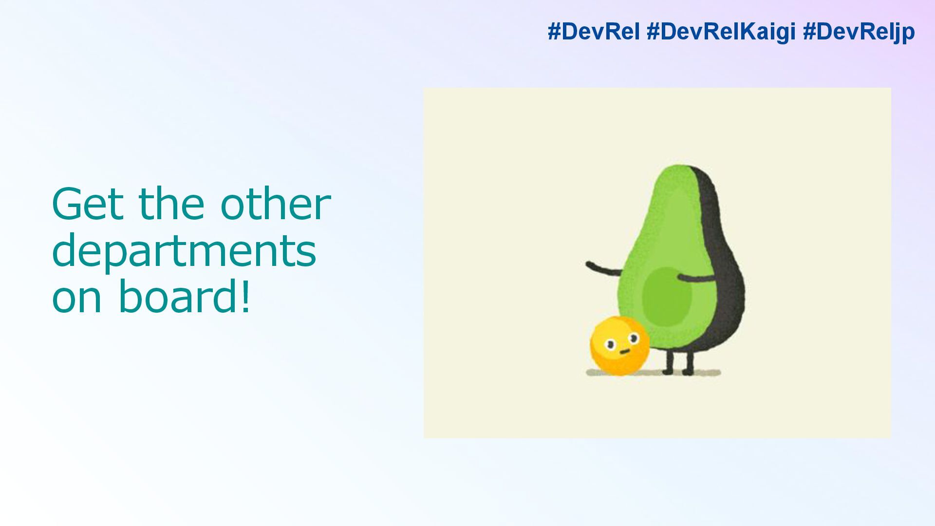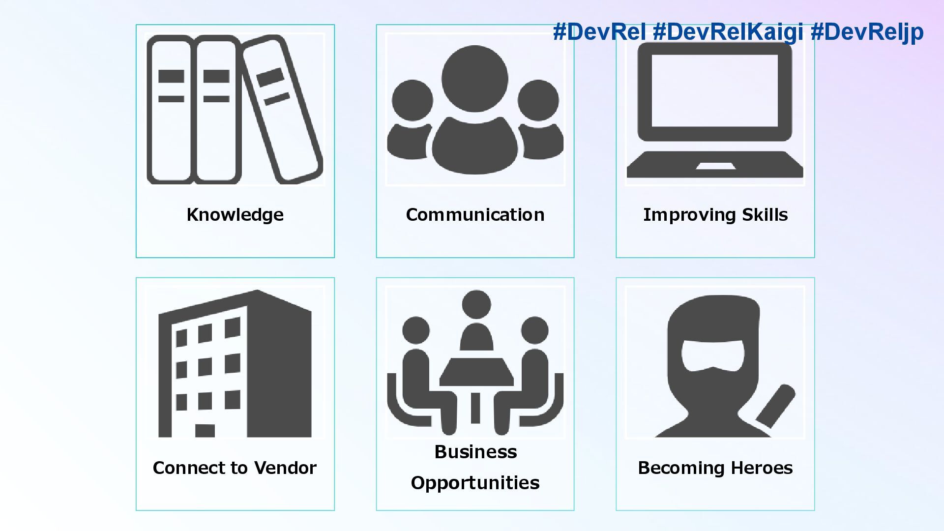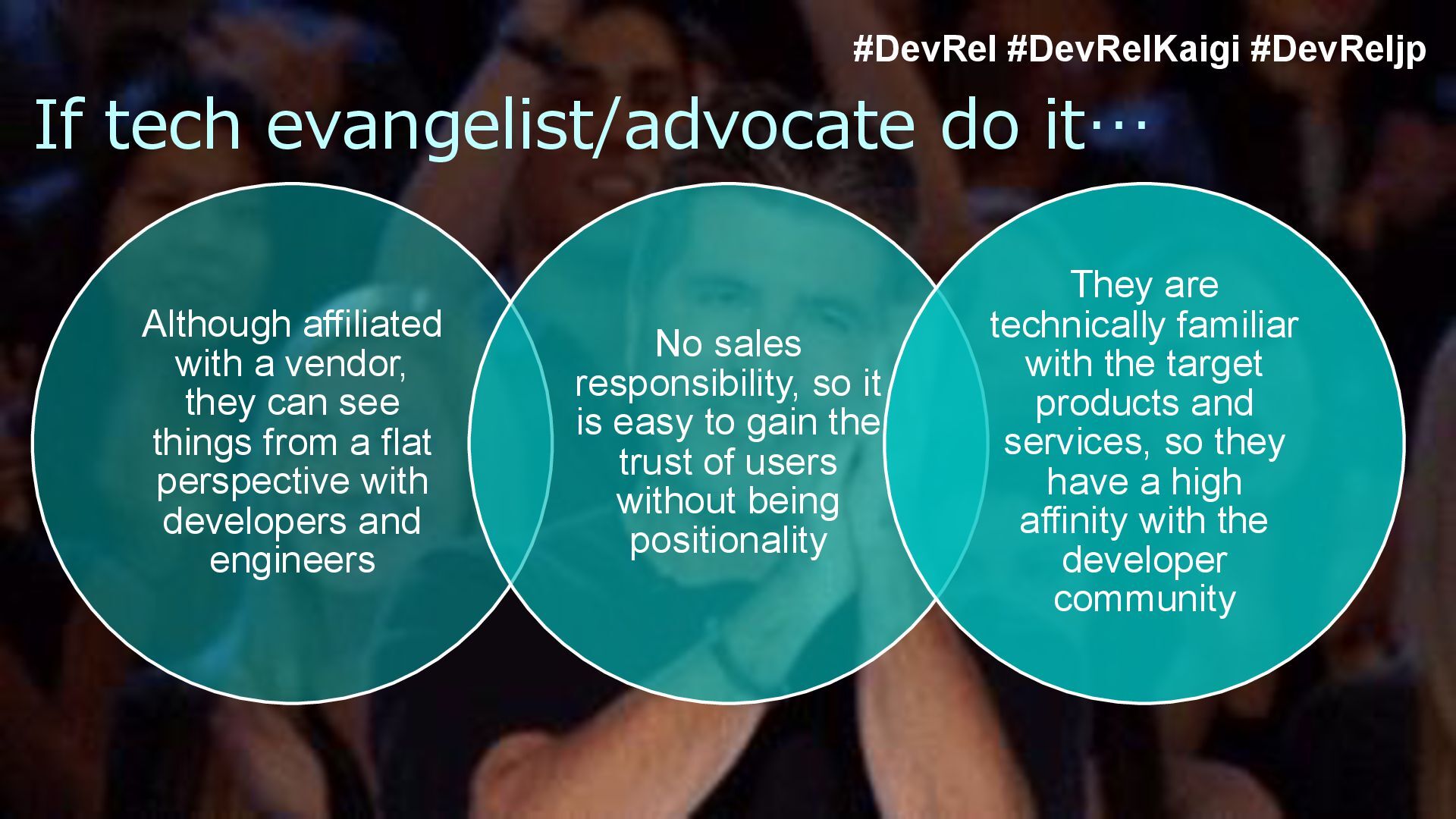 a flat perspective with developers and engineers No sales responsibility, so it is easy to gain the trust of users without being positionality They are technically familiar with the target products and services, so they have a high affinity with the developer community If tech evangelist/advocate do it… #DevRel #DevRelKaigi #DevReljp