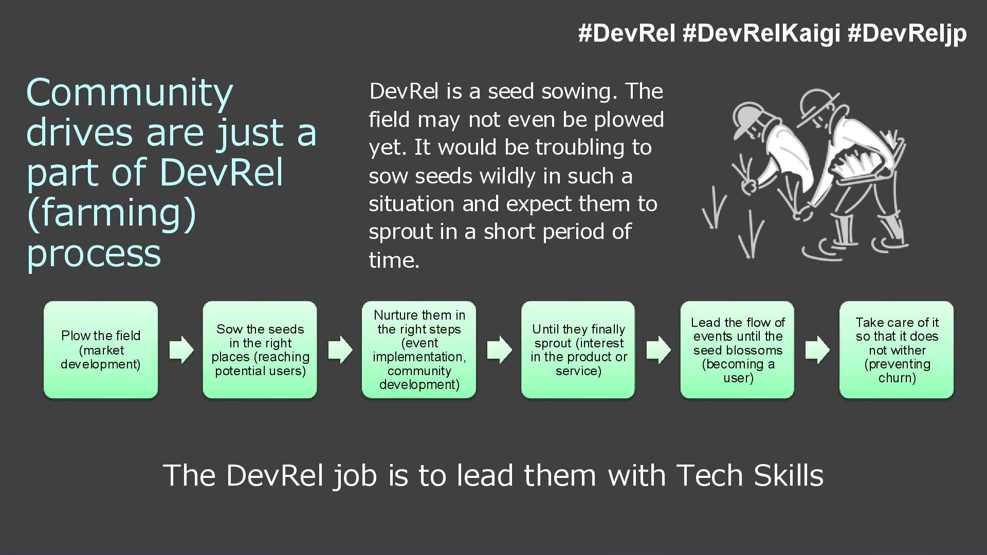 DevRel is a seed sowing. The field may not even be plowed yet. It would be troubling to sow seeds wildly in such a situation and expect them to sprout in a short period of time. Plow the field (market development) Sow the seeds in the right places (reaching potential users) Nurture them in the right steps (event implementation, community development) Until they finally sprout (interest in the product or service) Lead the flow of events until the seed blossoms (becoming a user) Take care of it so that it does not wither (preventing churn) The DevRel job is to lead them with Tech Skills #DevRel #DevRelKaigi #DevReljp