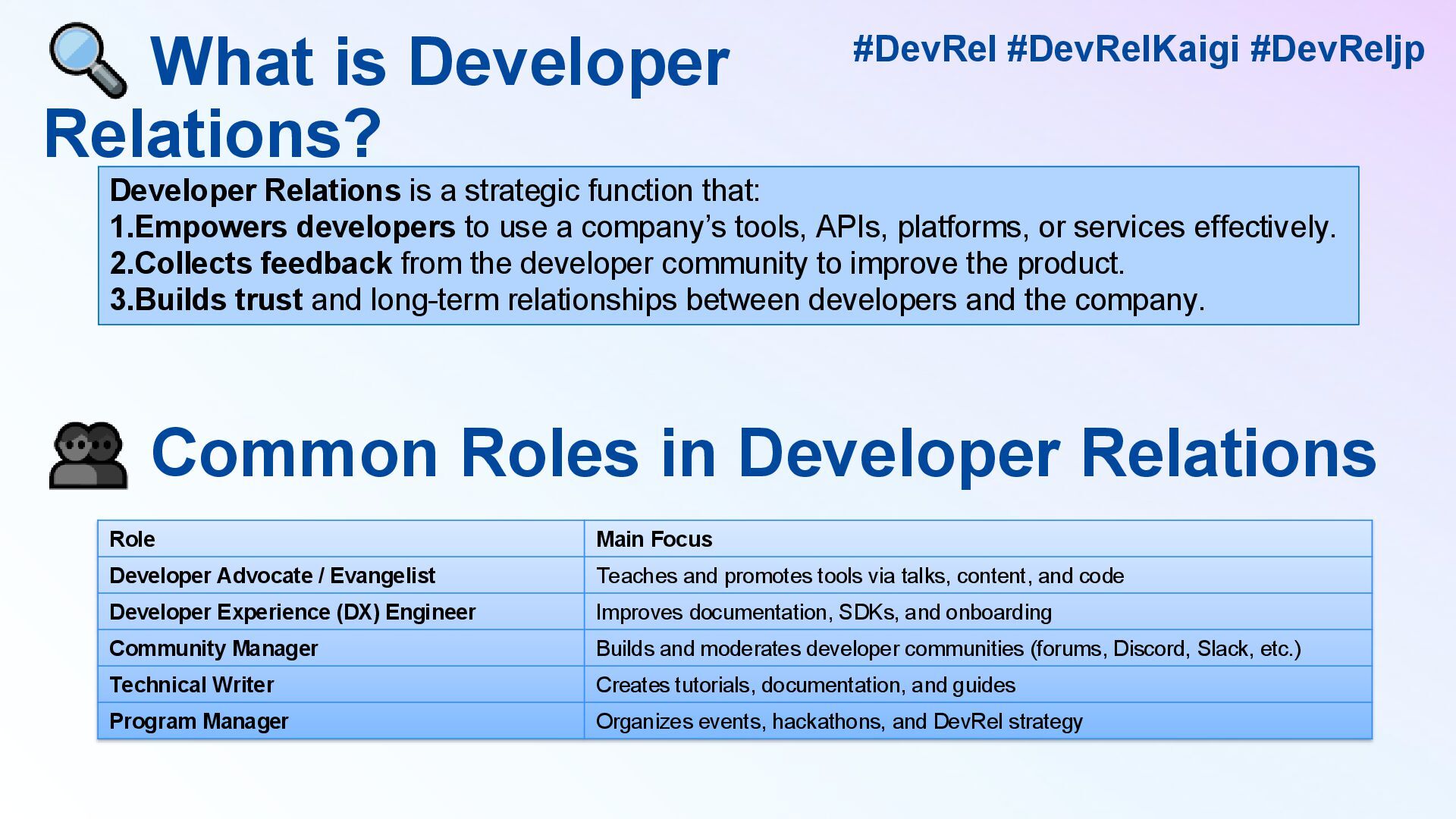 that: 1.Empowers developers to use a company’s tools, APIs, platforms, or services effectively. 2.Collects feedback from the developer community to improve the product. 3.Builds trust and long-term relationships between developers and the company. Common Roles in Developer Relations Role Main Focus Developer Advocate / Evangelist Teaches and promotes tools via talks, content, and code Developer Experience (DX) Engineer Improves documentation, SDKs, and onboarding Community Manager Builds and moderates developer communities (forums, Discord, Slack, etc.) Technical Writer Creates tutorials, documentation, and guides Program Manager Organizes events, hackathons, and DevRel strategy #DevRel #DevRelKaigi #DevReljp