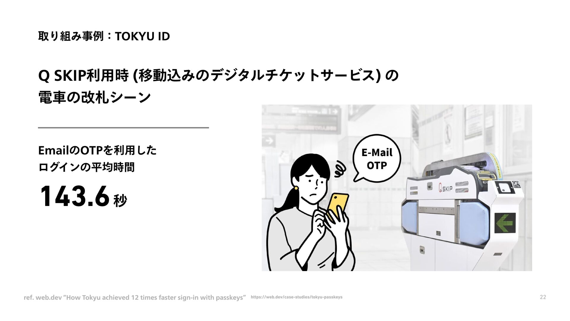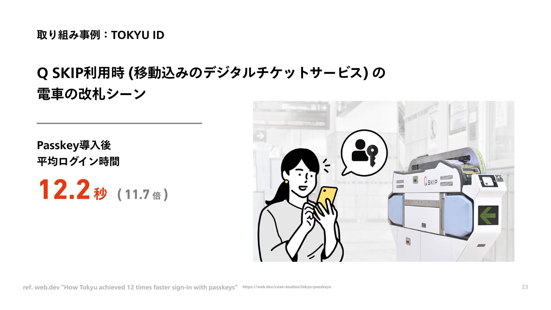 passkeys” https://web.dev/case-studies/tokyu-passkeys 22 Q SKIP利用時 (移動込みのデジタルチケットサービス) の
