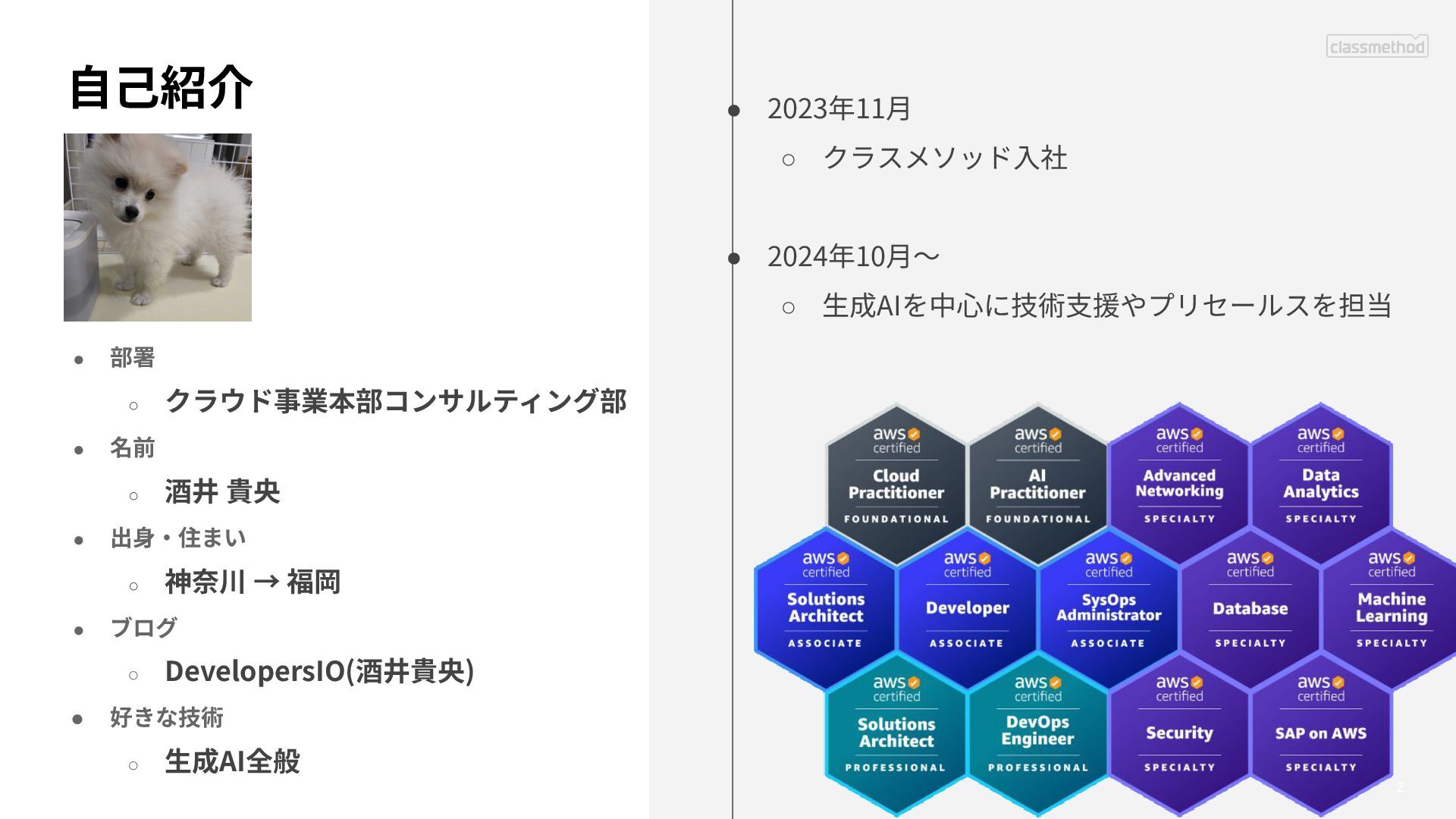 1. ⾃⼰紹介 2 • 2023年11⽉ ◦ クラスメソッド⼊社 • 2024年10⽉〜  ◦ ⽣成AIを中⼼に技術⽀援やプリセールスを担当
