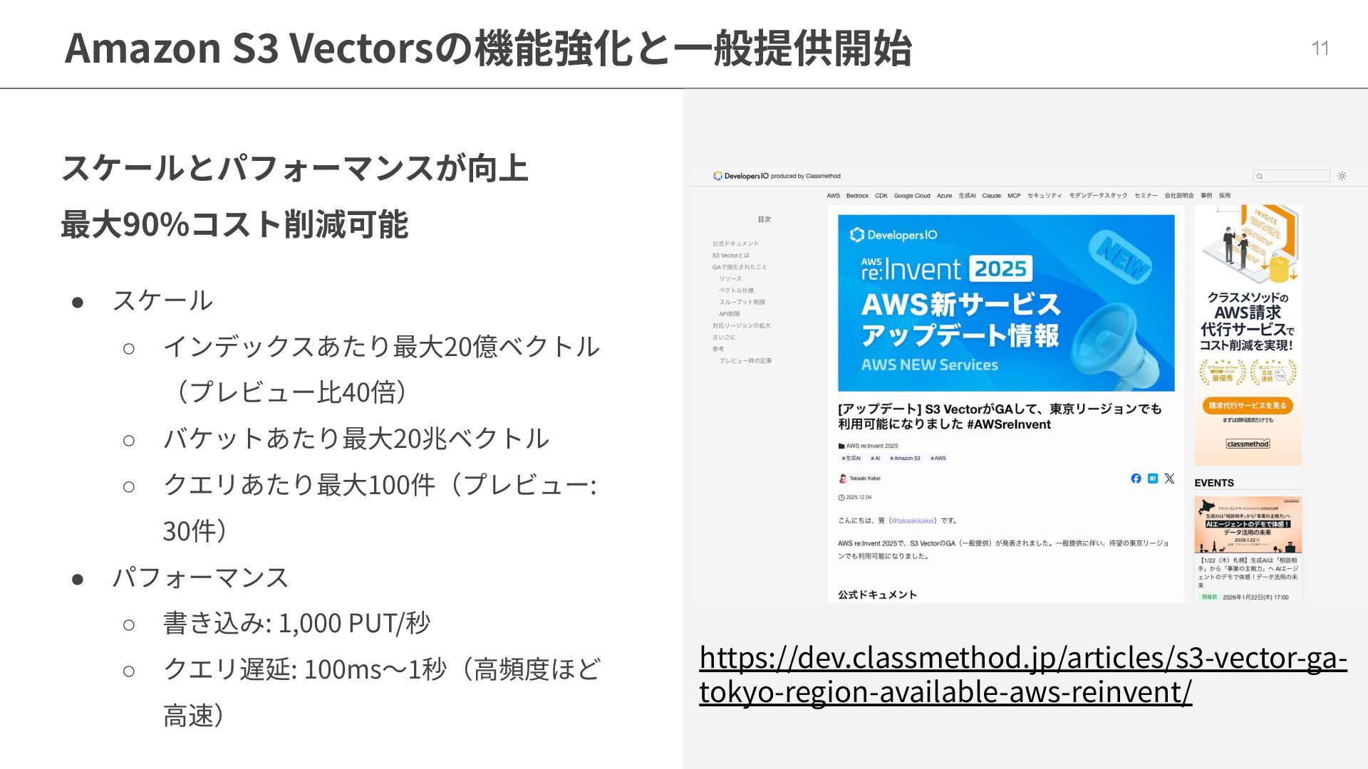 (プレビュー⽐40倍) ◦ バケットあたり最⼤20兆ベクトル ◦ クエリあたり最⼤100件(プレビュー: 30件) • パフォーマンス ◦ 書き込み: 1,000 PUT/秒 ◦ クエリ遅延: 100ms〜1秒(⾼頻度ほど ⾼速) https://dev.classmethod.jp/articles/s3-vector-ga- tokyo-region-available-aws-reinvent/