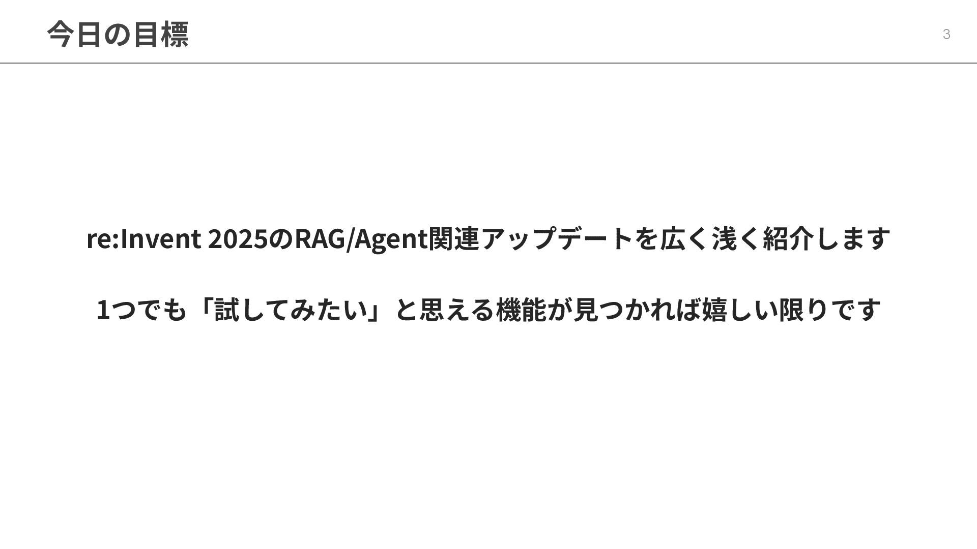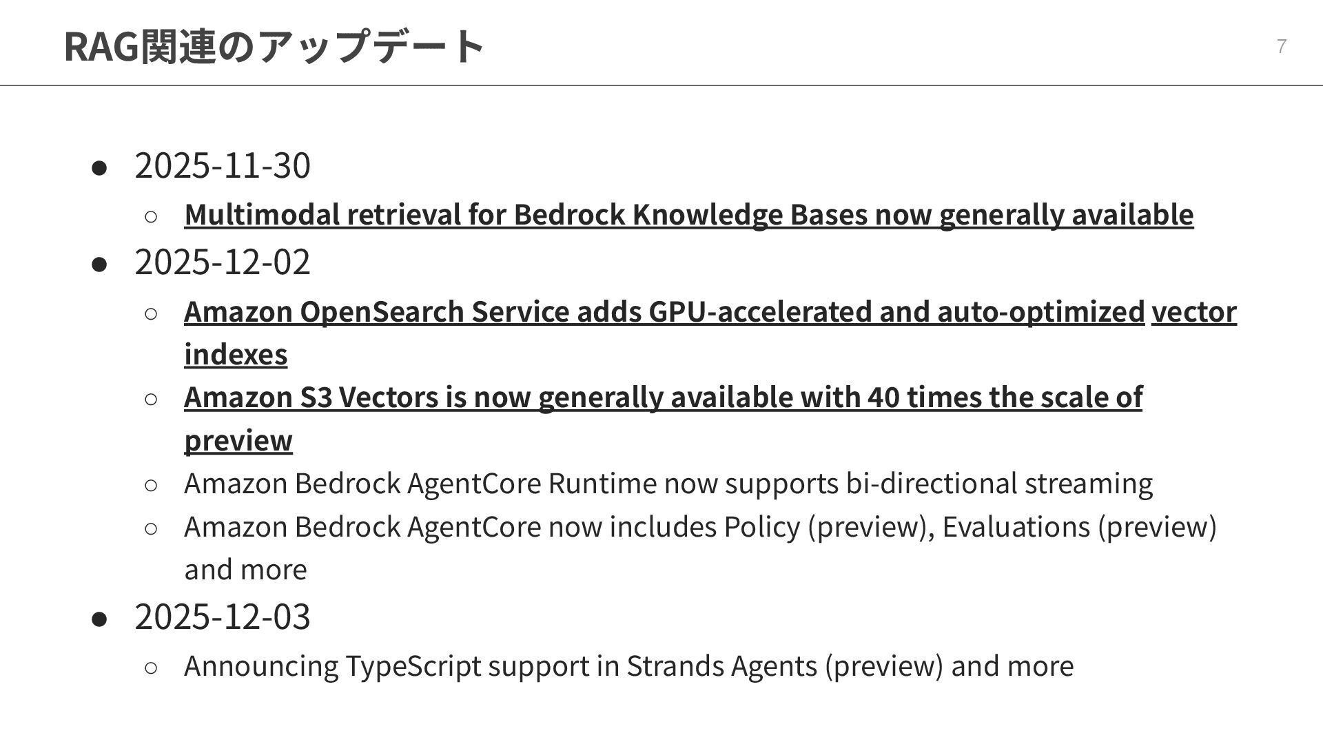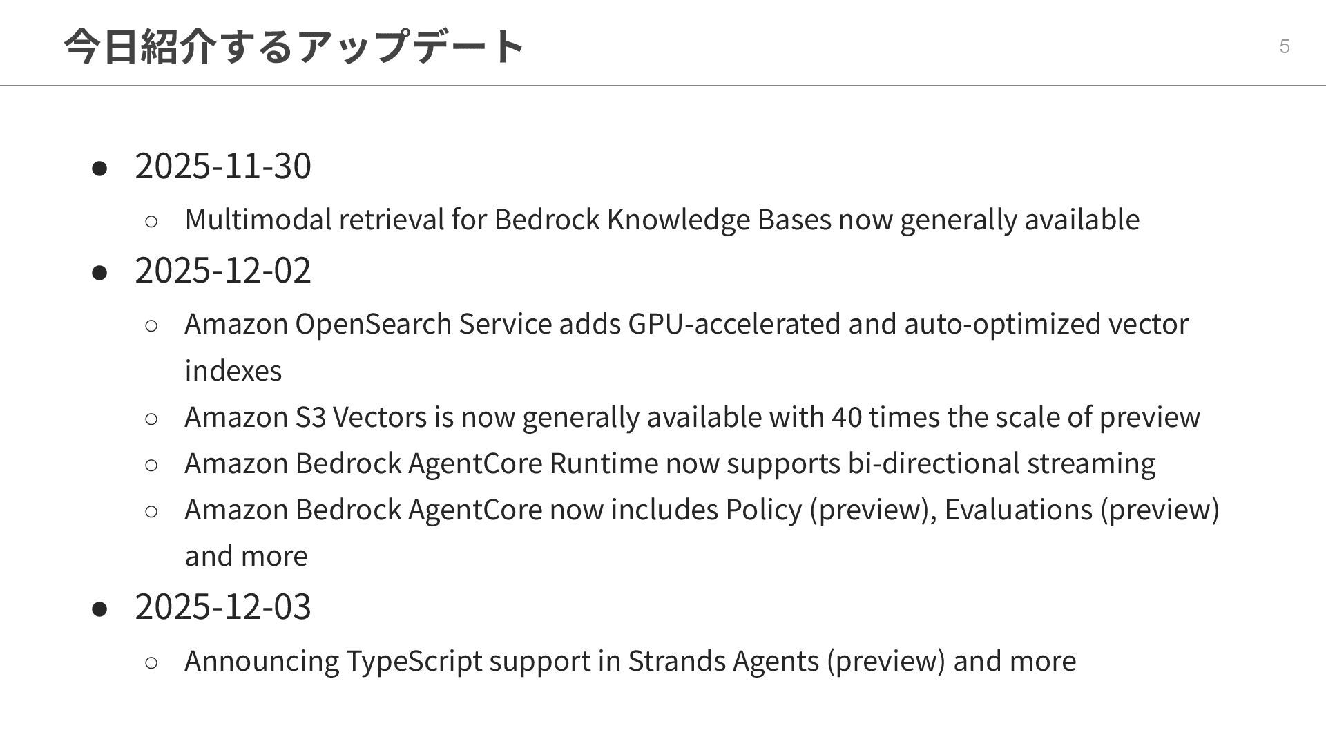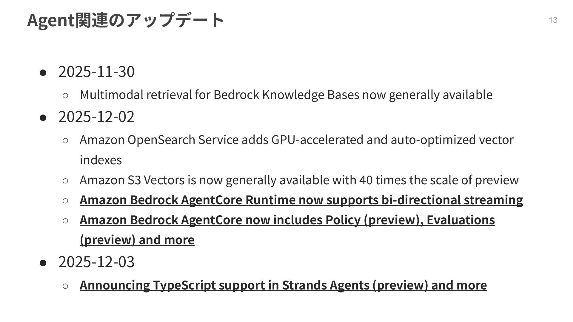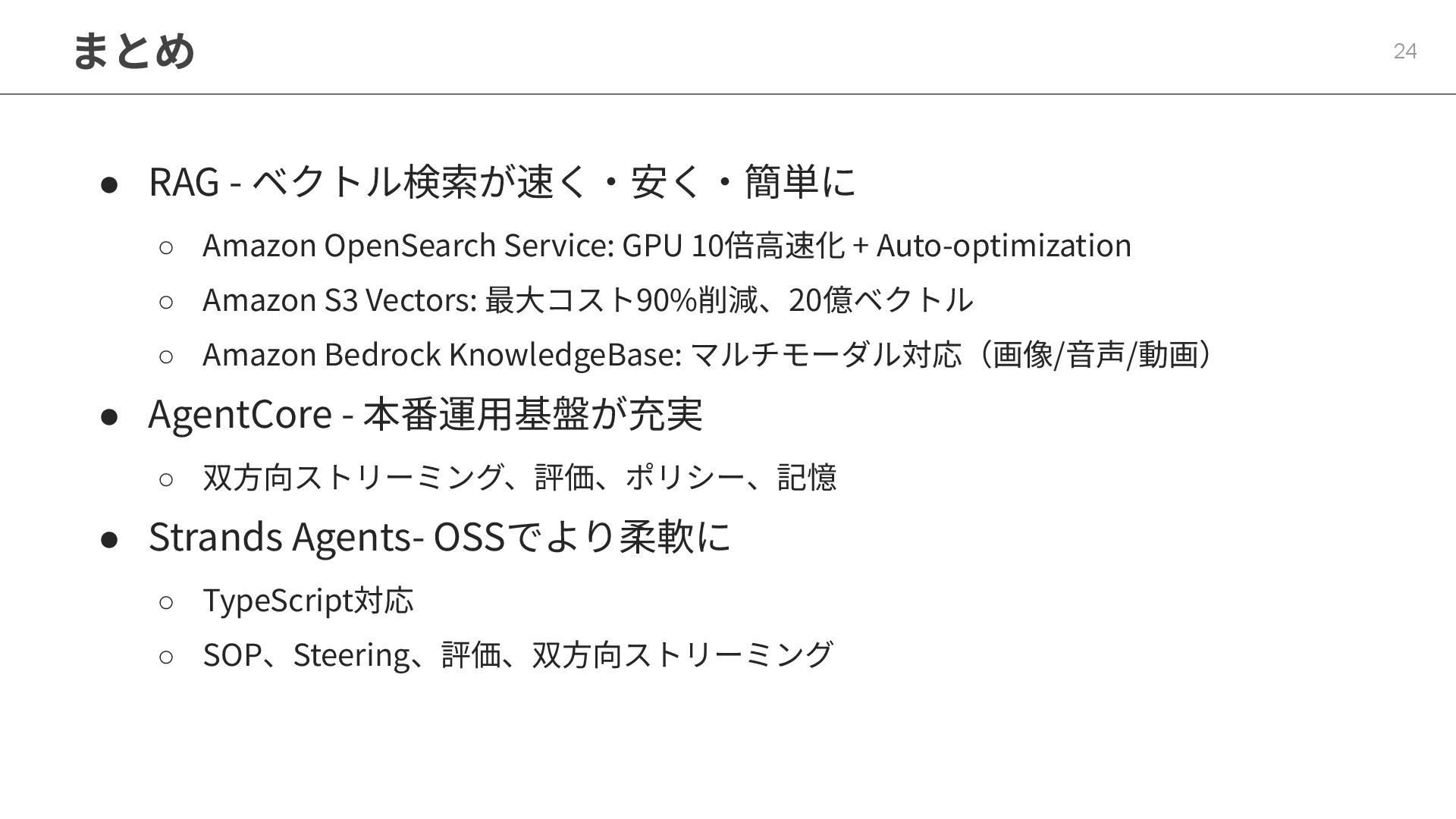 GPU 10倍⾼速化 + Auto-optimization ◦ Amazon S3 Vectors: 最⼤コスト90%削減、20億ベクトル ◦ Amazon Bedrock KnowledgeBase: マルチモーダル対応(画像/⾳声/動画) • AgentCore - 本番運⽤基盤が充実 ◦ 双⽅向ストリーミング、評価、ポリシー、記憶 • Strands Agents- OSSでより柔軟に ◦ TypeScript対応 ◦ SOP、Steering、評価、双⽅向ストリーミング