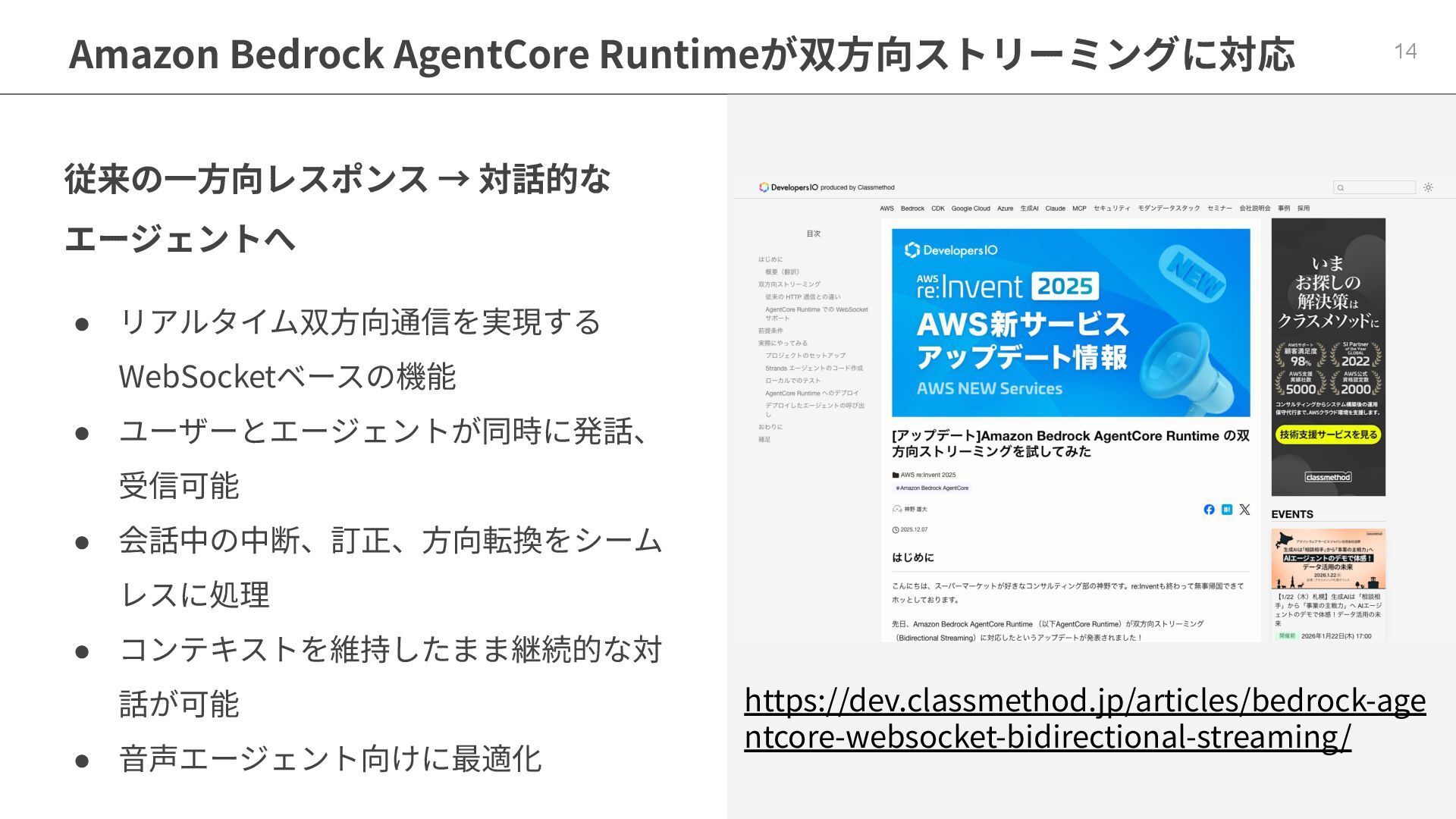 リアルタイム双⽅向通信を実現する WebSocketベースの機能 • ユーザーとエージェントが同時に発話、 受信可能 • 会話中の中断、訂正、⽅向転換をシーム レスに処理 • コンテキストを維持したまま継続的な対 話が可能 • ⾳声エージェント向けに最適化 https://dev.classmethod.jp/articles/bedrock-age ntcore-websocket-bidirectional-streaming/