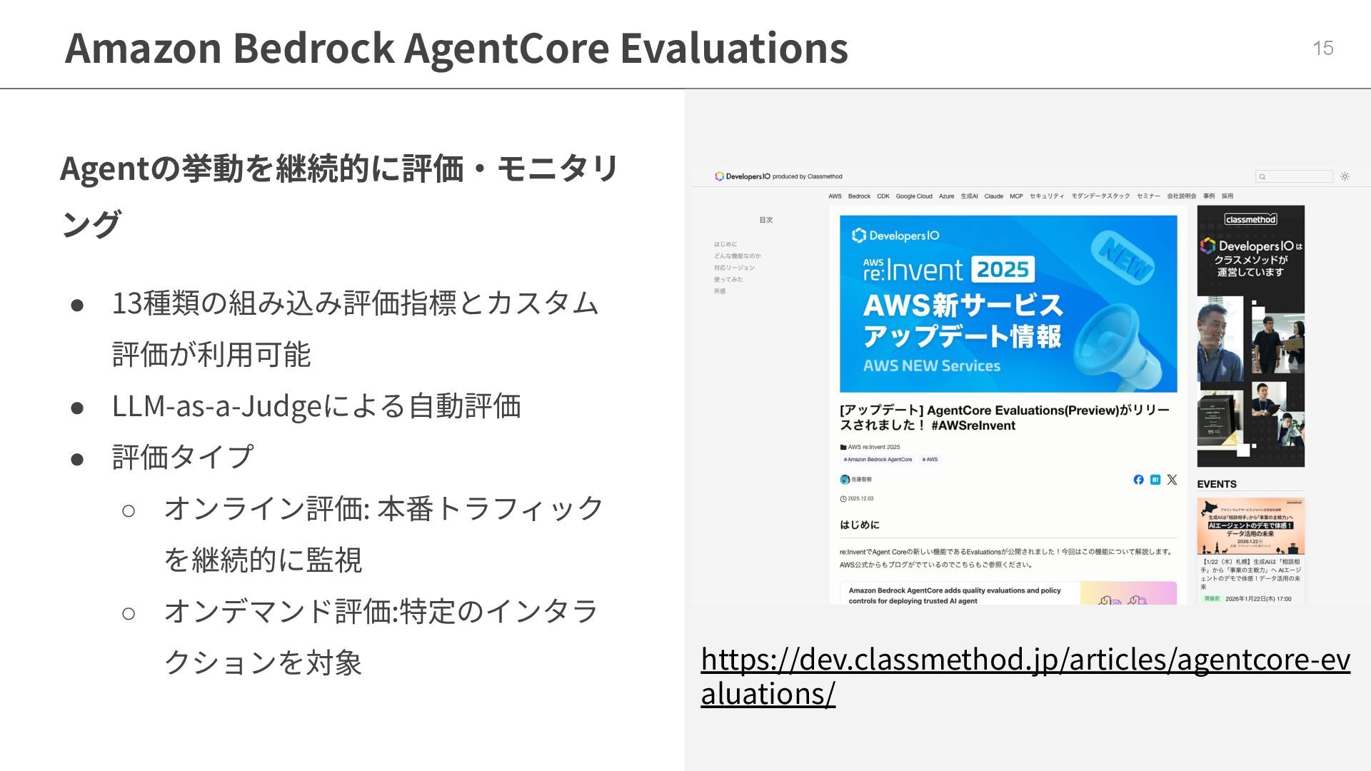 • LLM-as-a-Judgeによる⾃動評価 • 評価タイプ ◦ オンライン評価: 本番トラフィック を継続的に監視 ◦ オンデマンド評価:特定のインタラ クションを対象 https://dev.classmethod.jp/articles/agentcore-ev aluations/