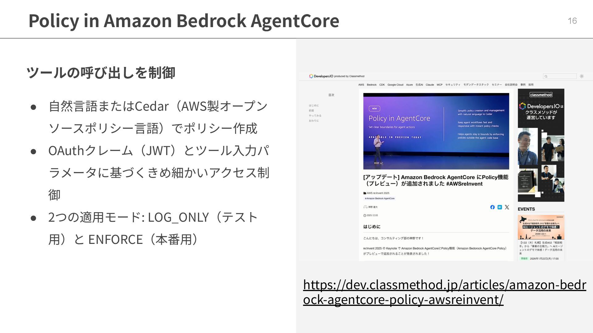 • OAuthクレーム(JWT)とツール⼊⼒パ ラメータに基づくきめ細かいアクセス制 御 • 2つの適⽤モード: LOG_ONLY(テスト ⽤)と ENFORCE(本番⽤) https://dev.classmethod.jp/articles/amazon-bedr ock-agentcore-policy-awsreinvent/