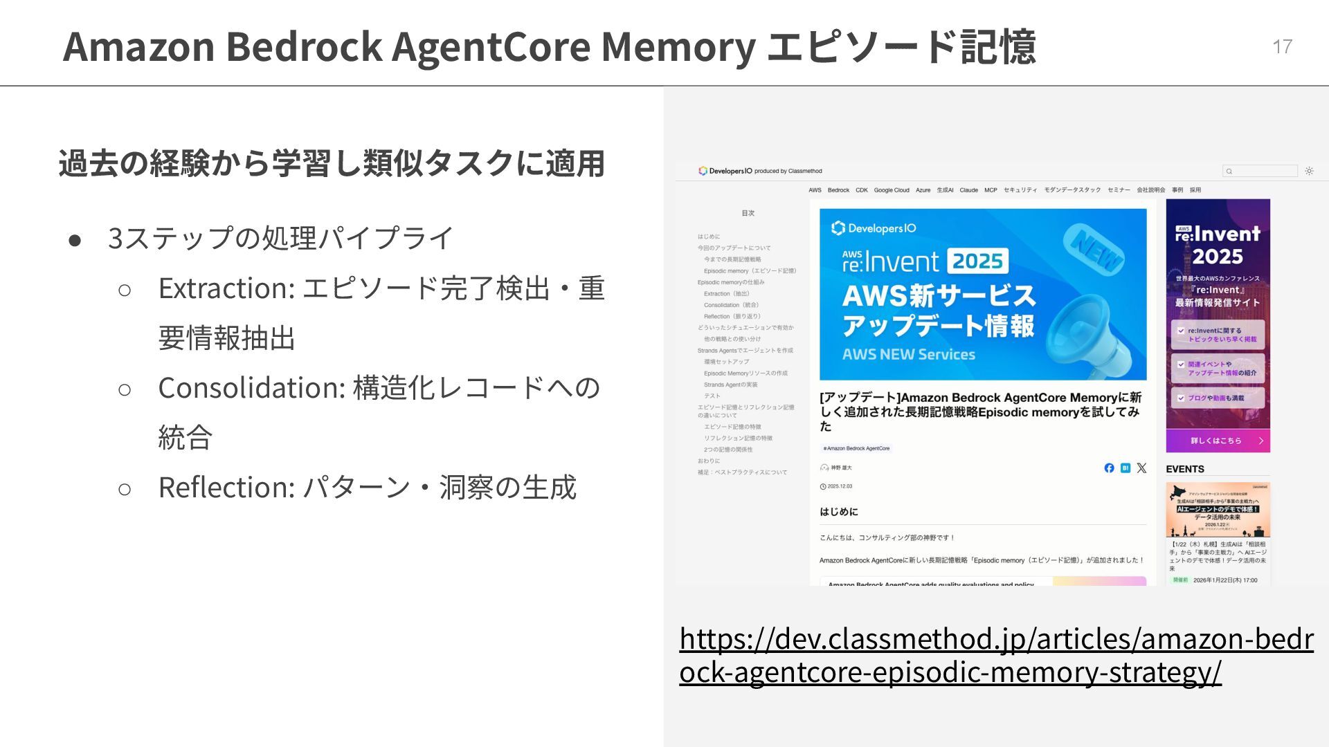 Extraction: エピソード完了検出‧重 要情報抽出 ◦ Consolidation: 構造化レコードへの 統合 ◦ Reflection: パターン‧洞察の⽣成 https://dev.classmethod.jp/articles/amazon-bedr ock-agentcore-episodic-memory-strategy/