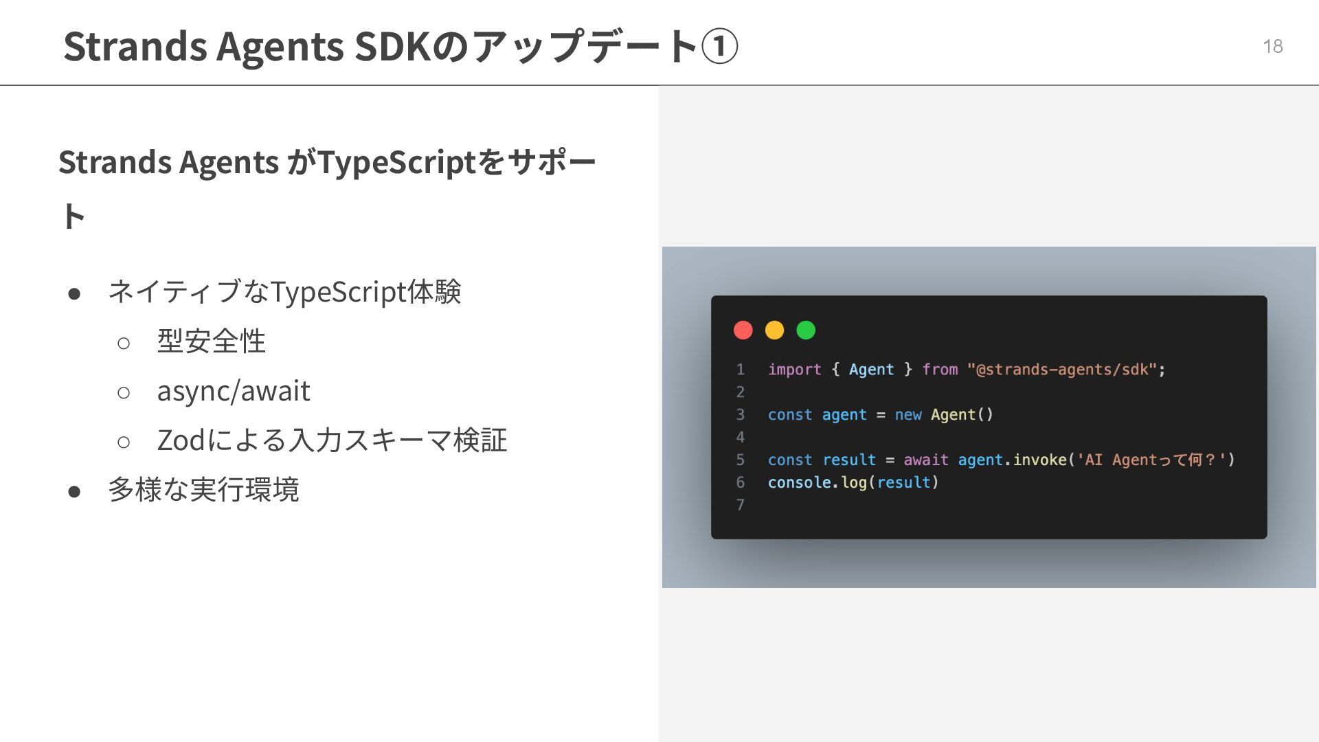 14. Strands Agents SDKのアップデート① 18 Strands Agents がTypeScriptをサポー ト • ネイティブなTypeScript体験