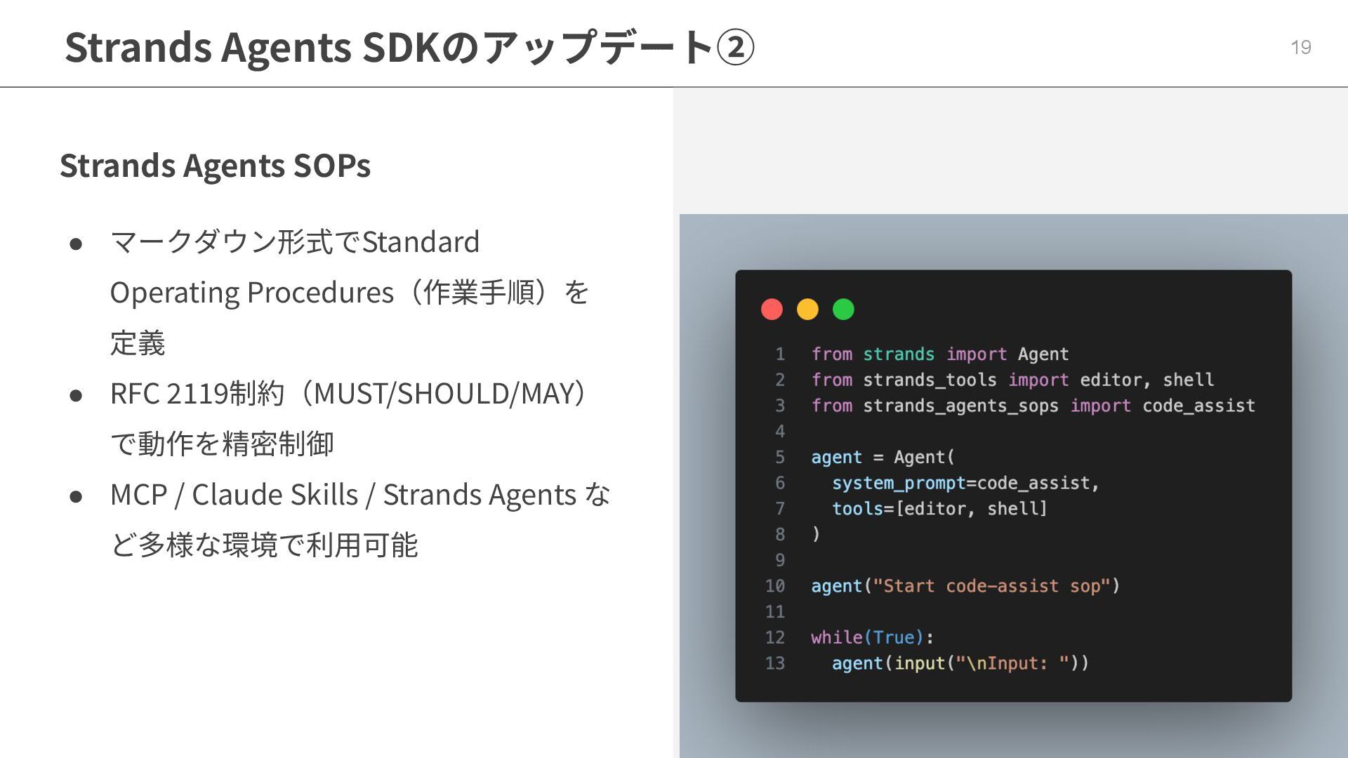 15. Strands Agents SDKのアップデート② 19 Strands Agents SOPs • マークダウン形式でStandard Operating
