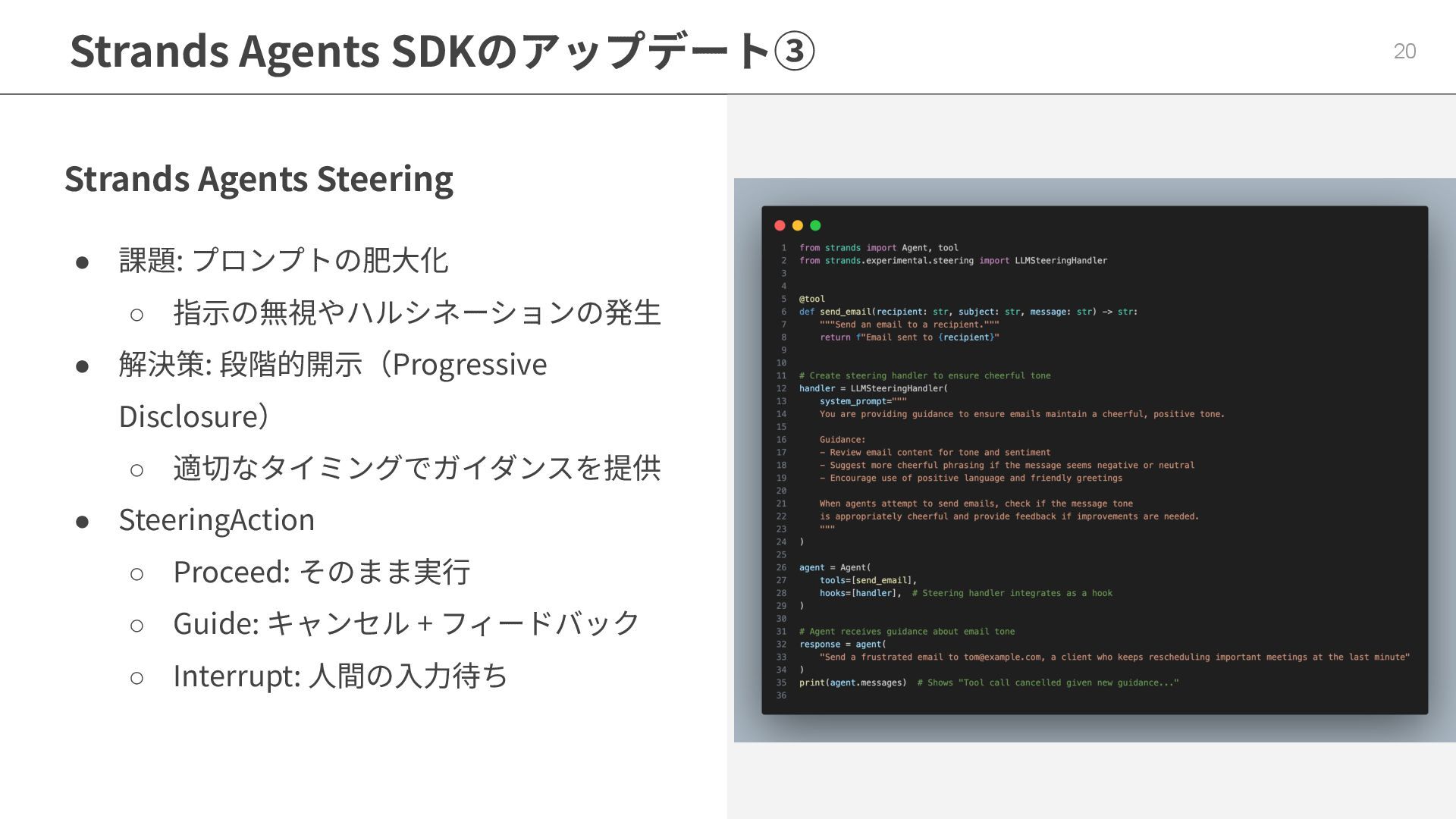 16. Strands Agents SDKのアップデート③ 20 Strands Agents Steering • 課題: プロンプトの肥⼤化