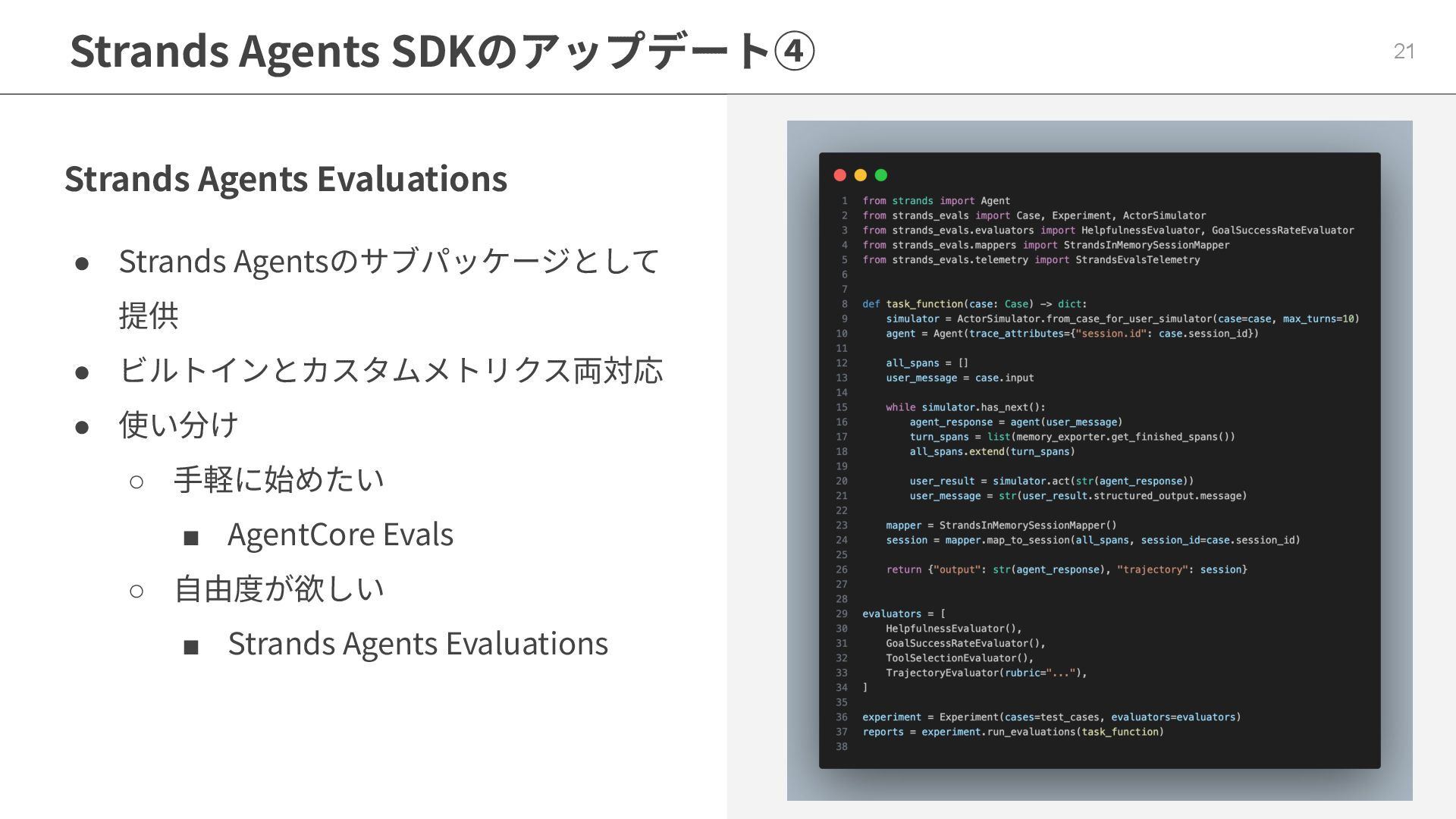 提供 • ビルトインとカスタムメトリクス両対応 • 使い分け ◦ ⼿軽に始めたい ▪ AgentCore Evals ◦ ⾃由度が欲しい ▪ Strands Agents Evaluations