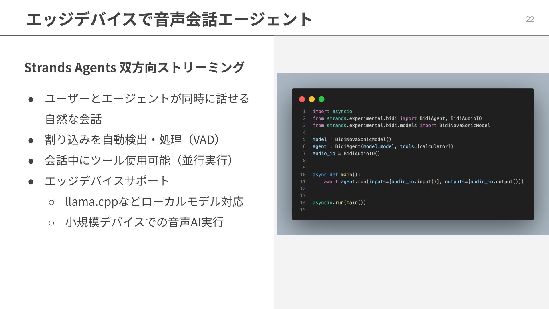18. エッジデバイスで⾳声会話エージェント 22 Strands Agents 双⽅向ストリーミング • ユーザーとエージェントが同時に話せる ⾃然な会話 • 割り込みを⾃動検出‧処理(VAD)