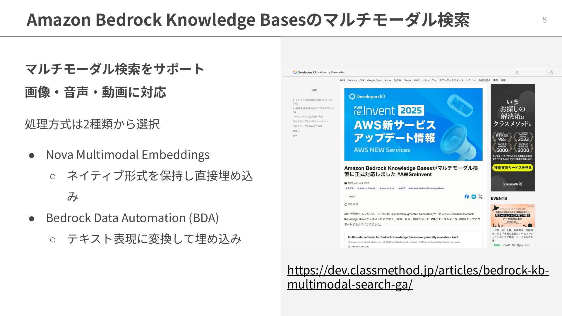 Multimodal Embeddings ◦ ネイティブ形式を保持し直接埋め込 み • Bedrock Data Automation (BDA) ◦ テキスト表現に変換して埋め込み https://dev.classmethod.jp/articles/bedrock-kb- multimodal-search-ga/