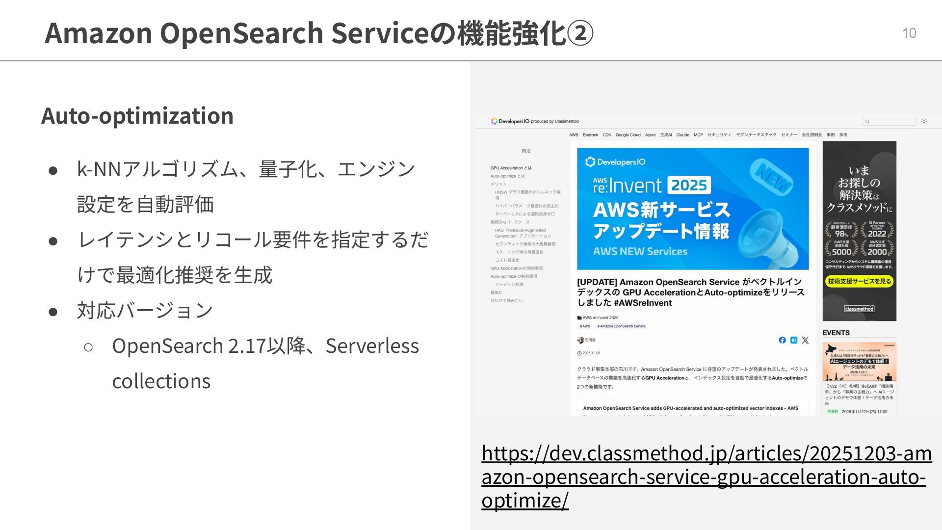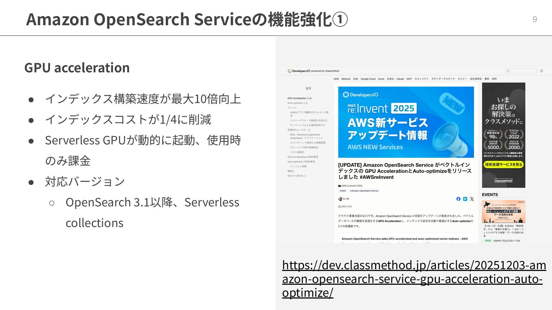 • Serverless GPUが動的に起動、使⽤時 のみ課⾦ • 対応バージョン ◦ OpenSearch 3.1以降、Serverless collections https://dev.classmethod.jp/articles/20251203-am azon-opensearch-service-gpu-acceleration-auto- optimize/