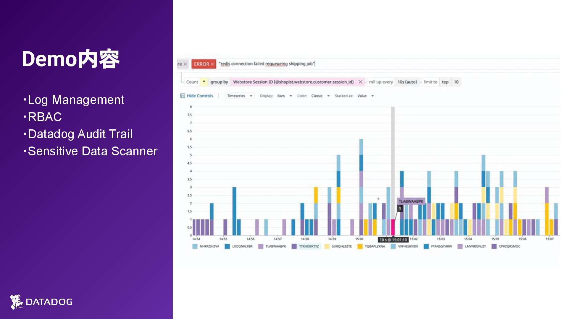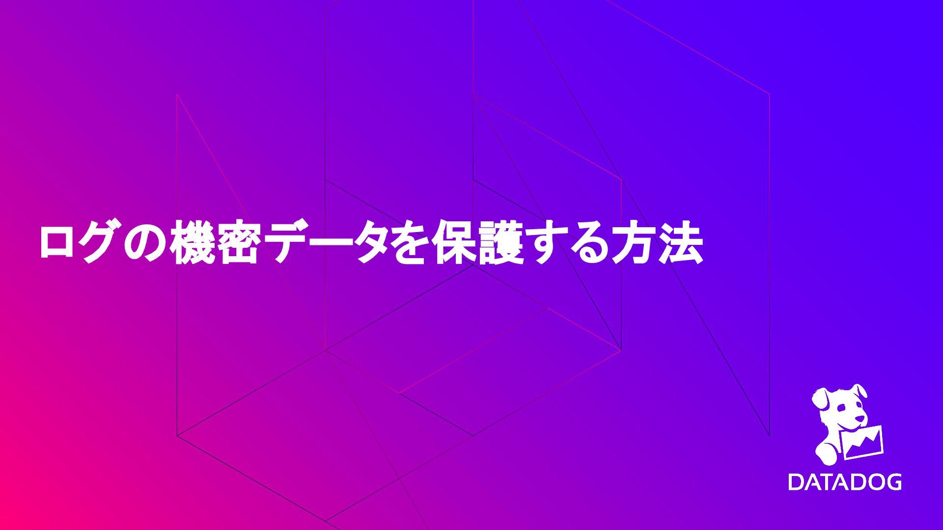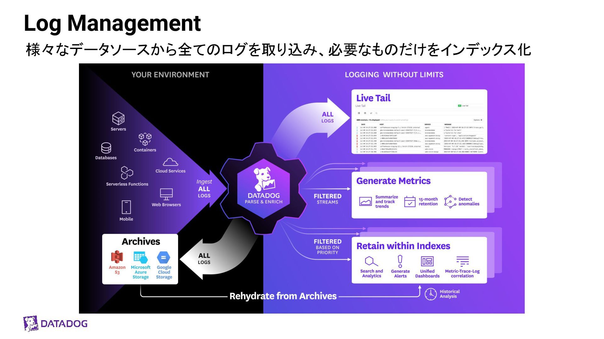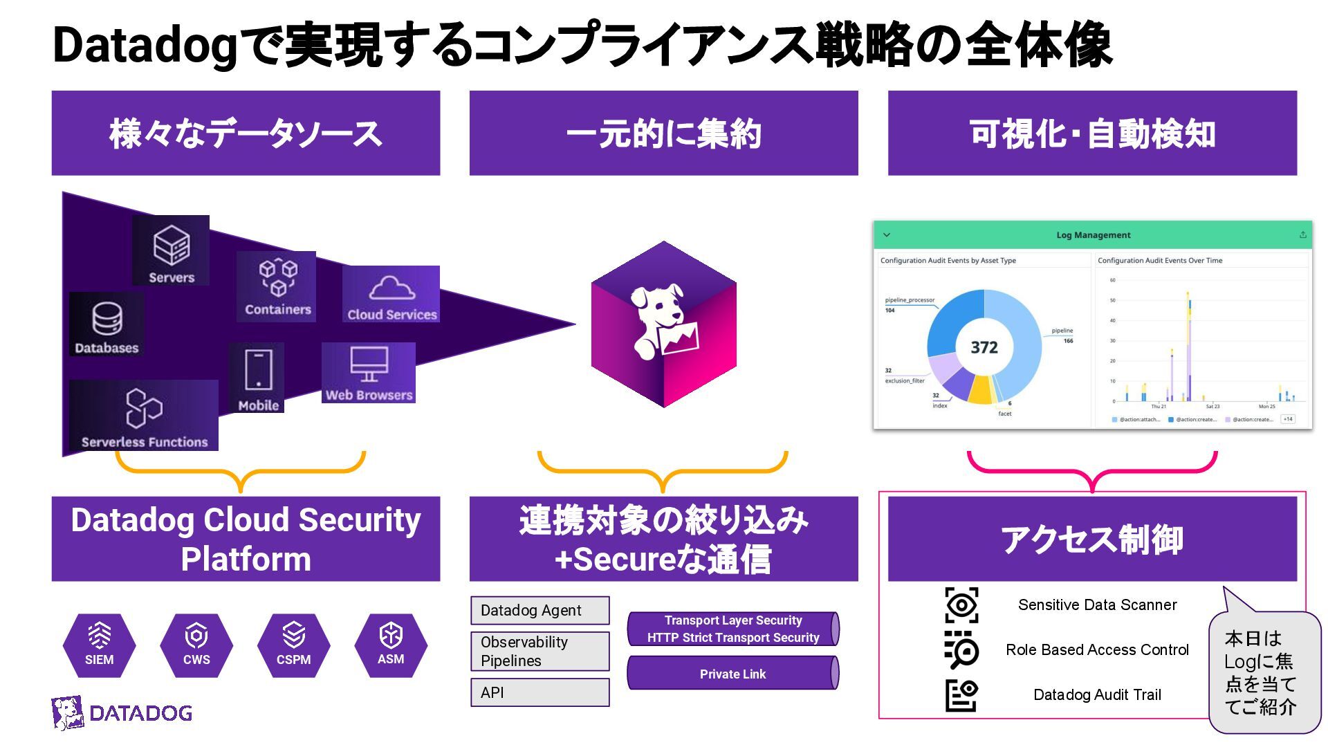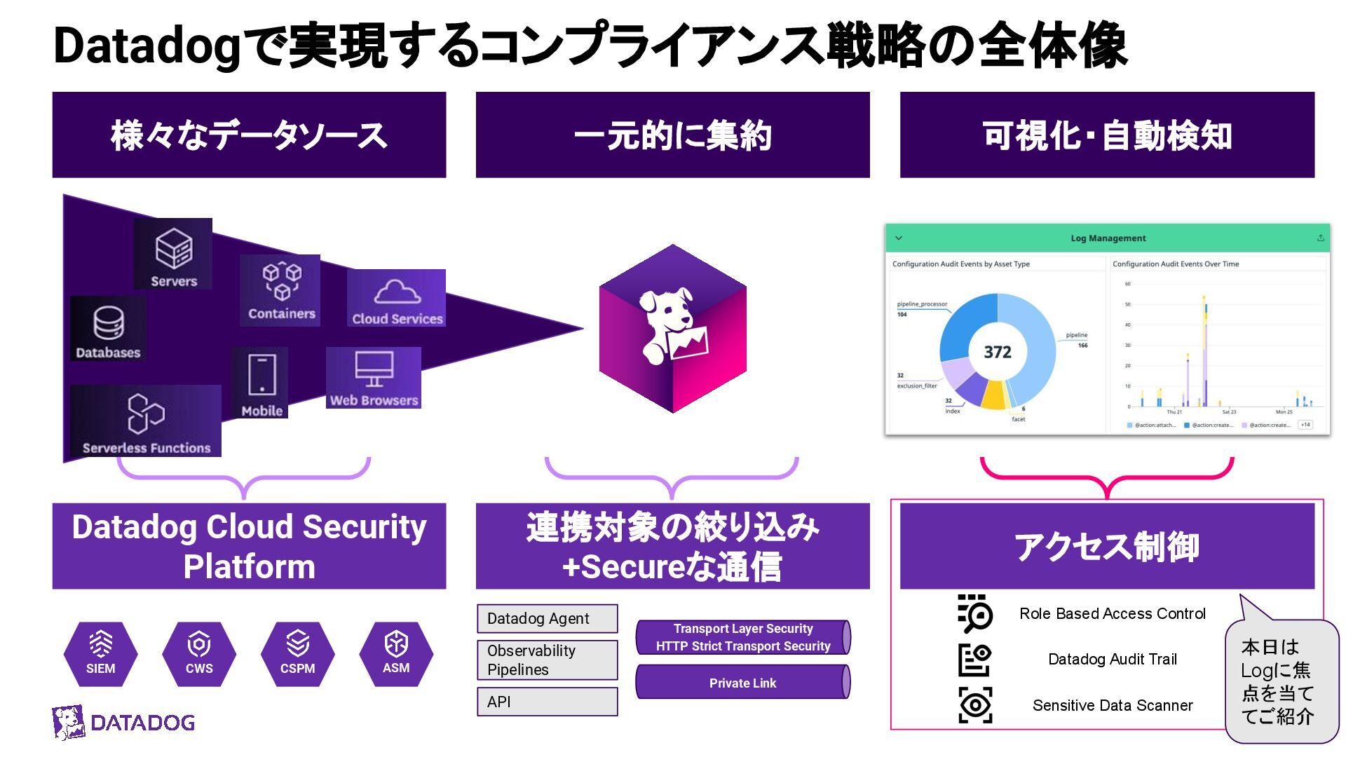 アクセス制御 SIEM CSPM CWS ASM Transport Layer Security HTTP Strict Transport Security Private Link Sensitive Data Scanner Role Based Access Control Datadog Audit Trail Datadog Agent Observability Pipelines API 本日は Logに焦 点を当て てご紹介