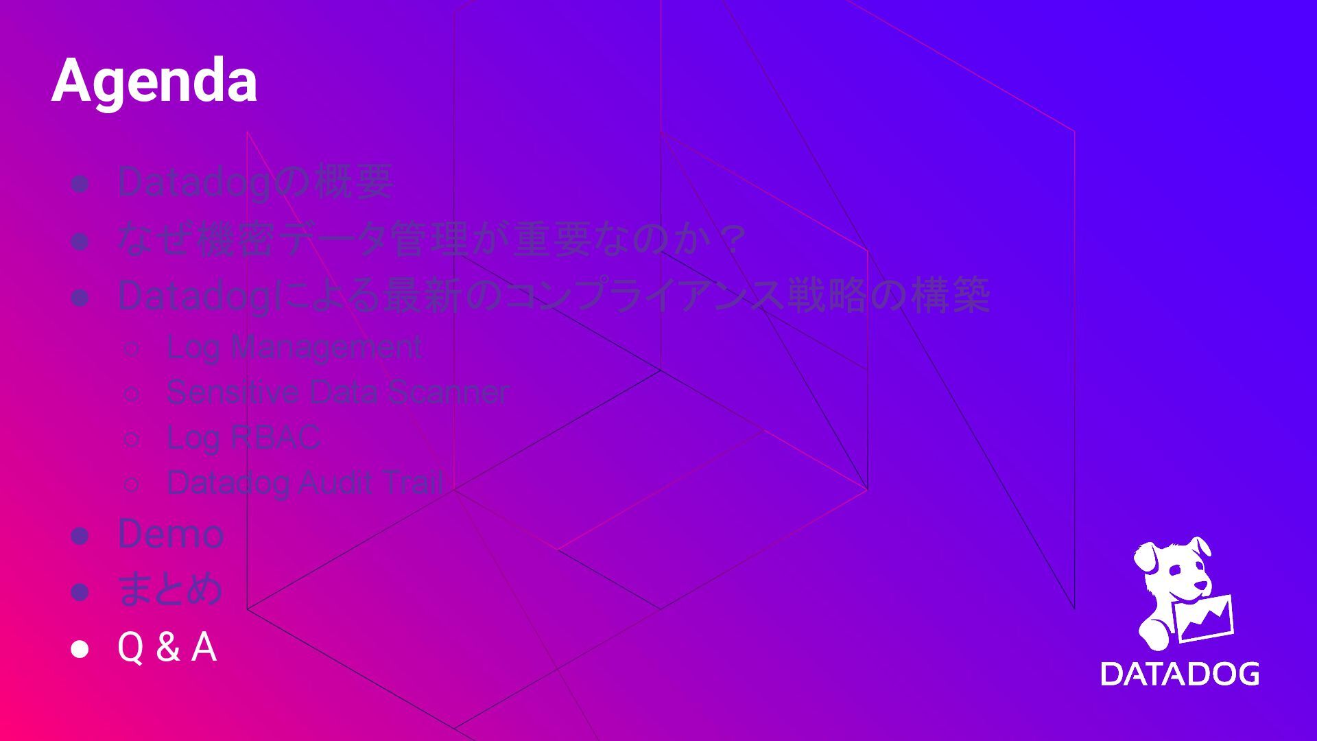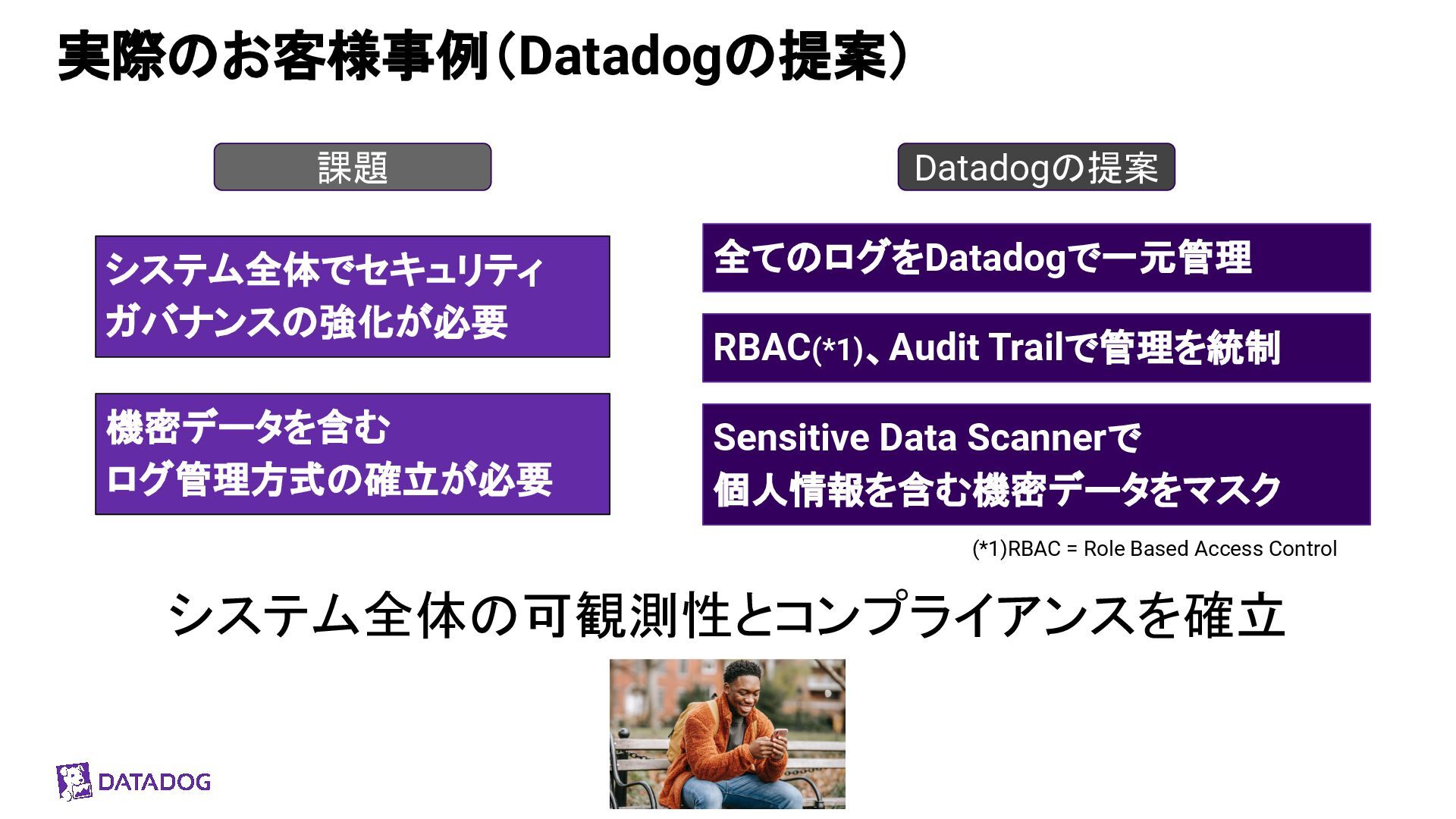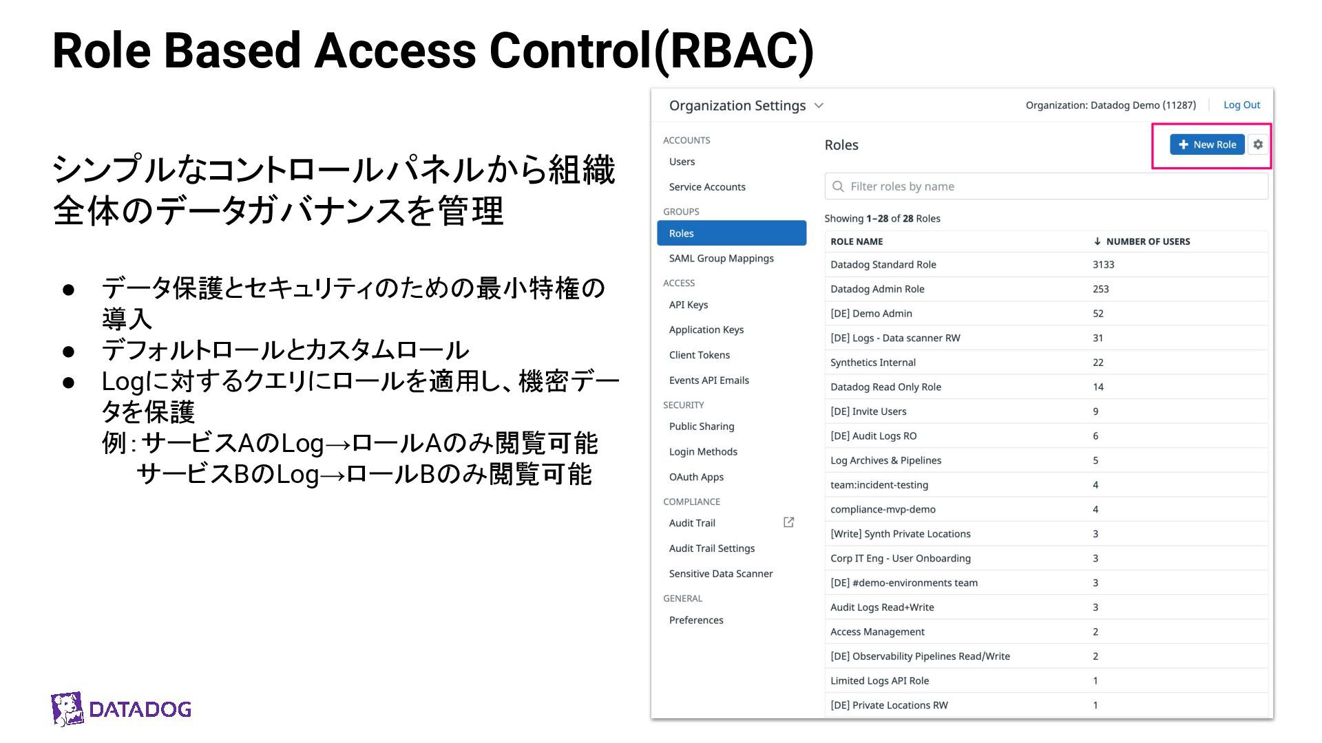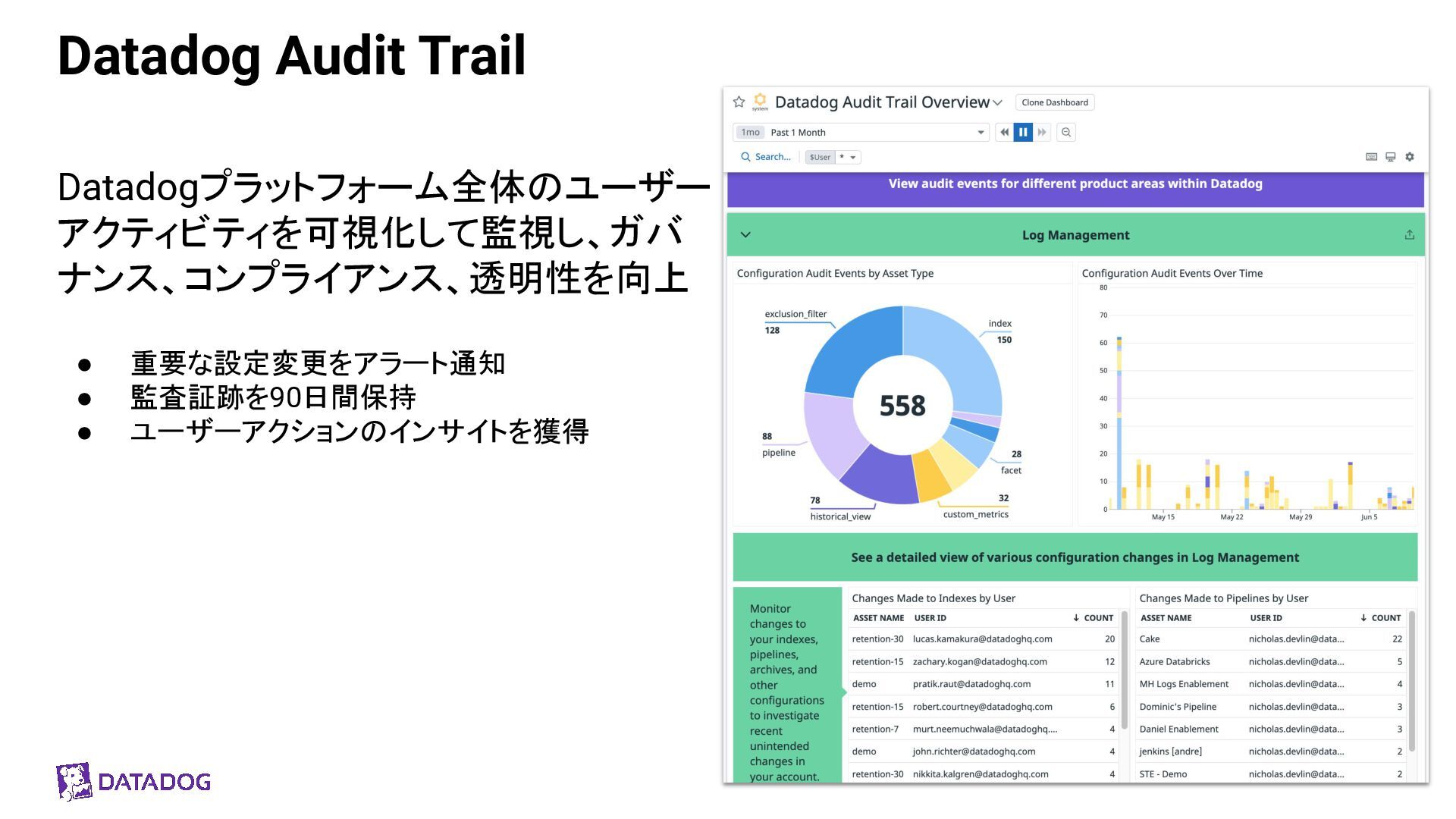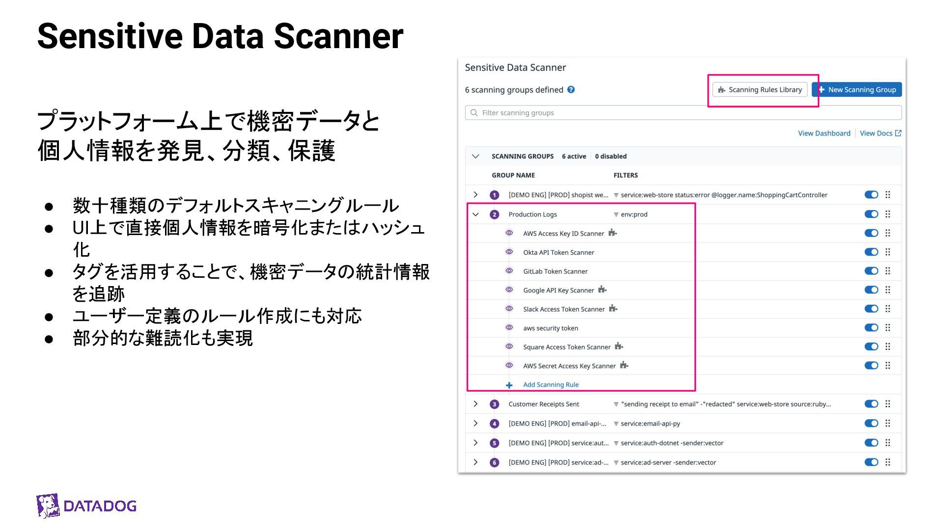 アクセス制御 SIEM CSPM CWS ASM Transport Layer Security HTTP Strict Transport Security Private Link Sensitive Data Scanner Role Based Access Control Datadog Audit Trail Datadog Agent Observability Pipelines API 本日は Logに焦 点を当て てご紹介