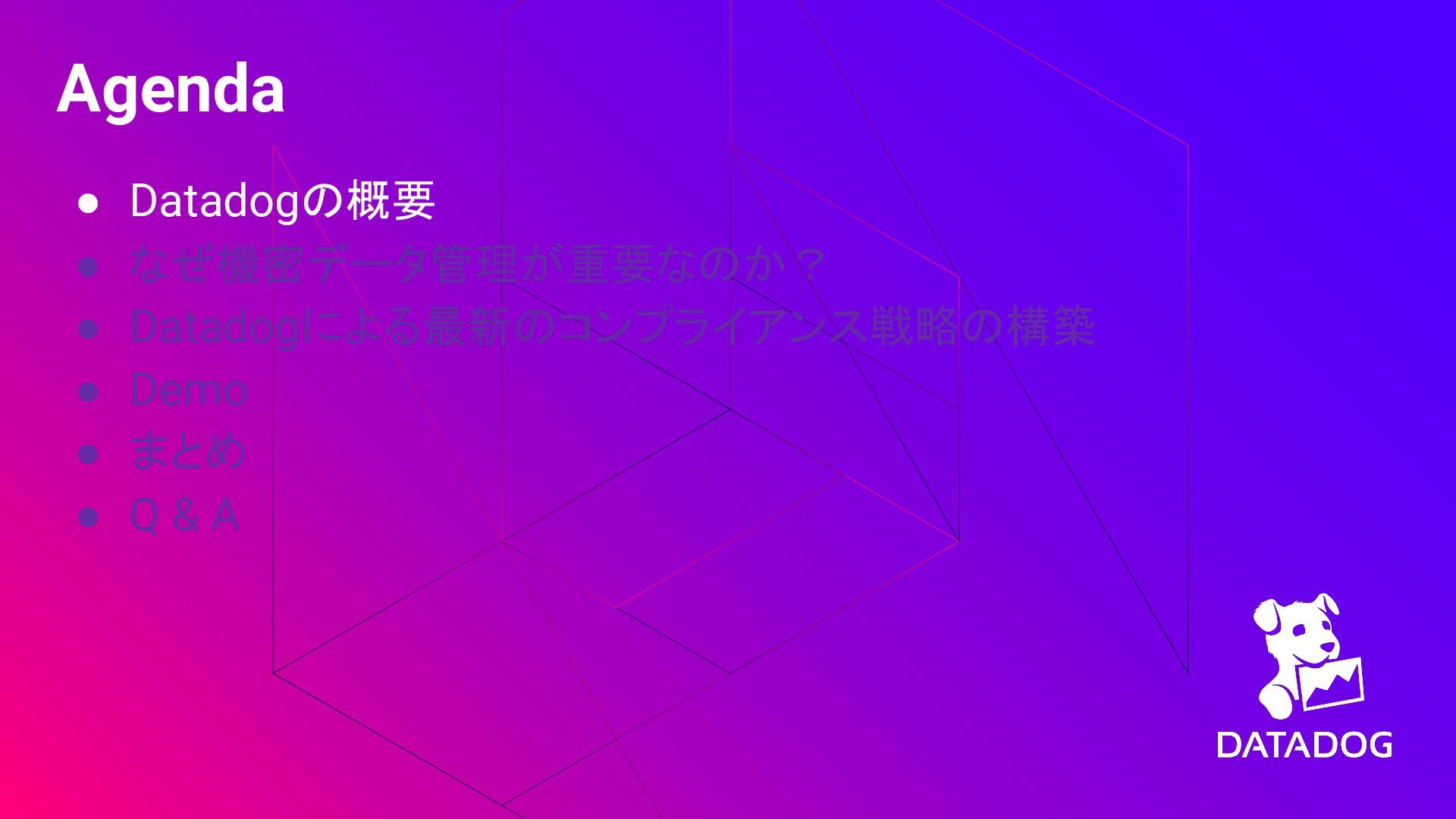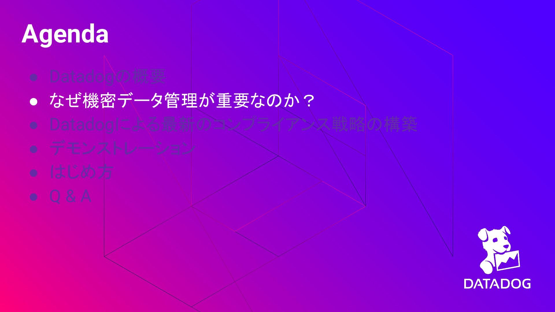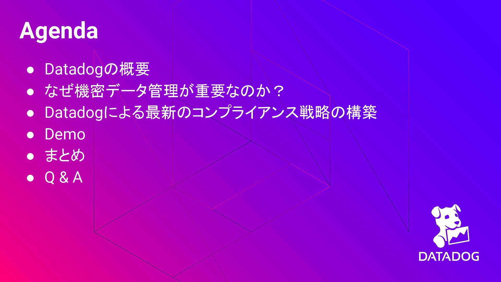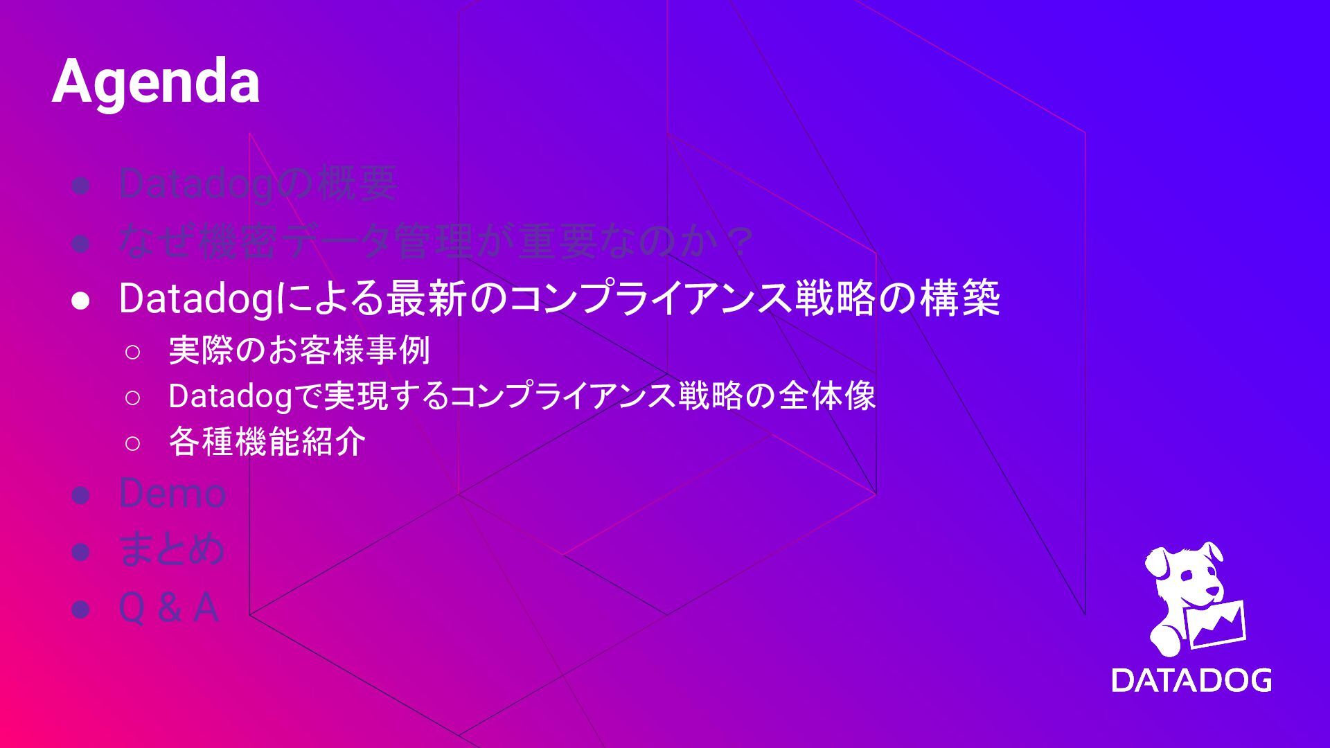 アクセス制御 SIEM CSPM CWS ASM Transport Layer Security HTTP Strict Transport Security Private Link Sensitive Data Scanner Role Based Access Control Datadog Audit Trail Datadog Agent Observability Pipelines API 本日は Logに焦 点を当て てご紹介