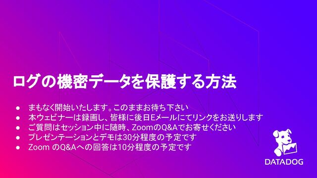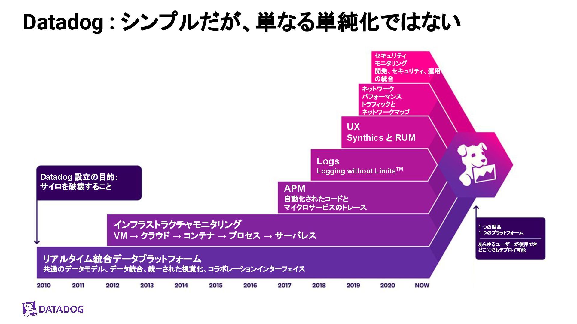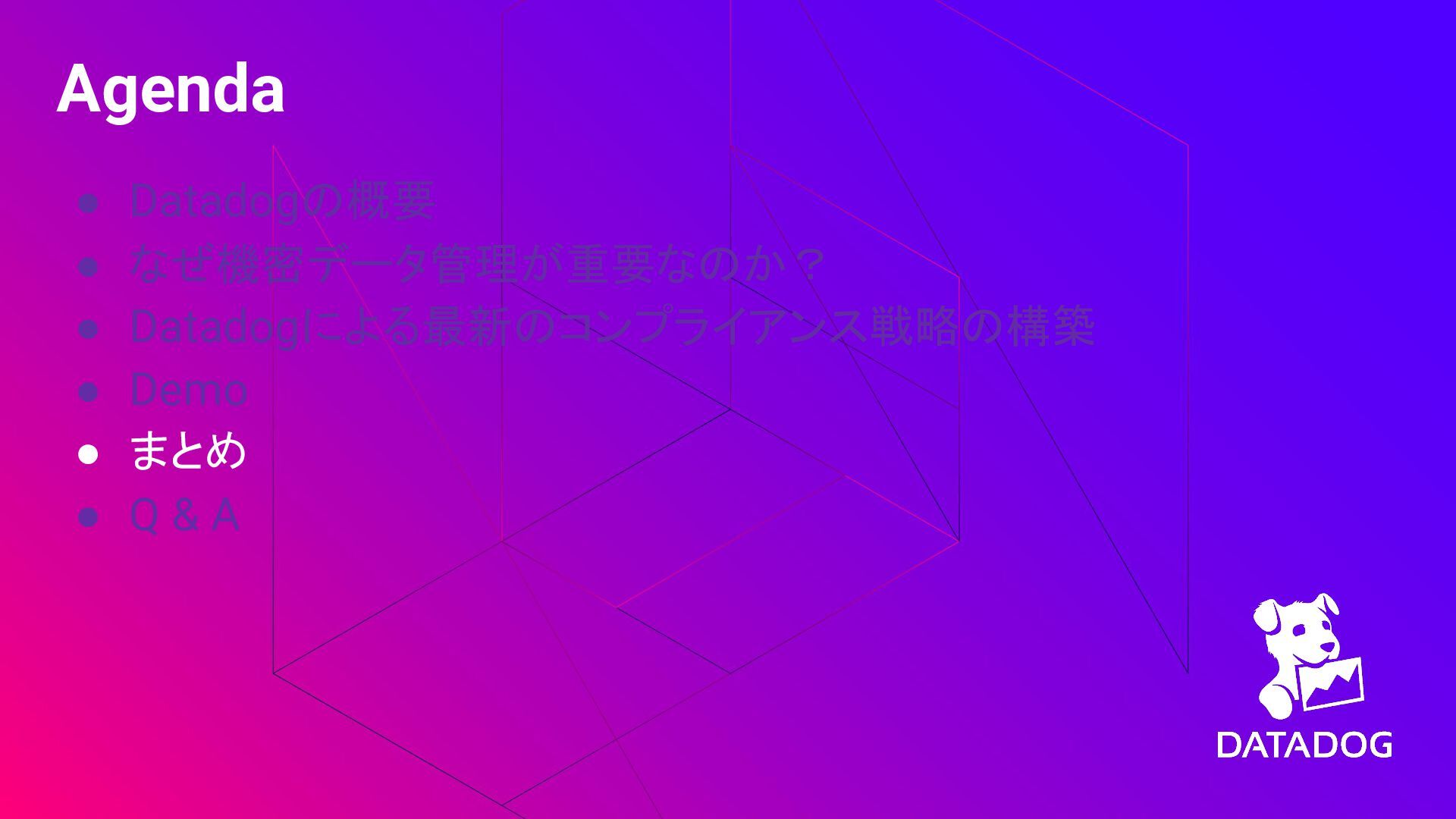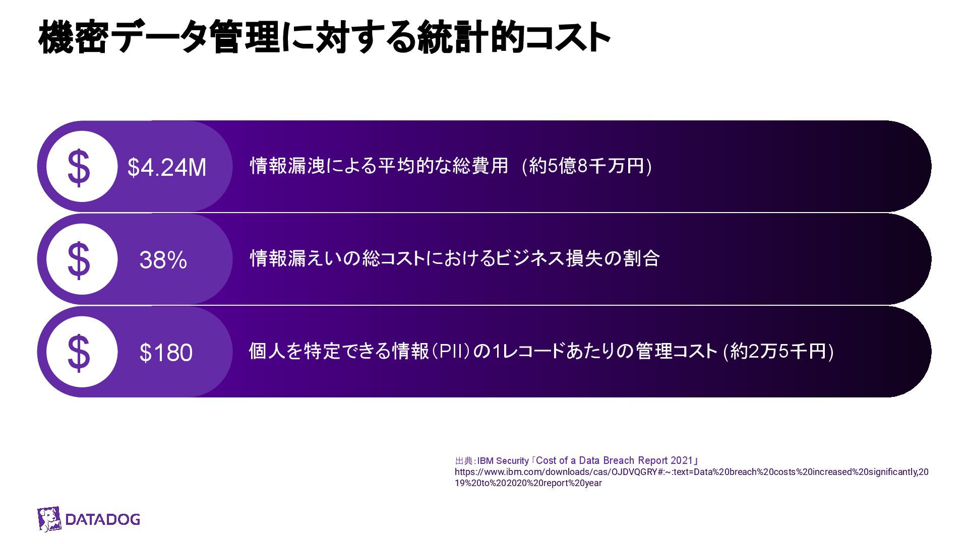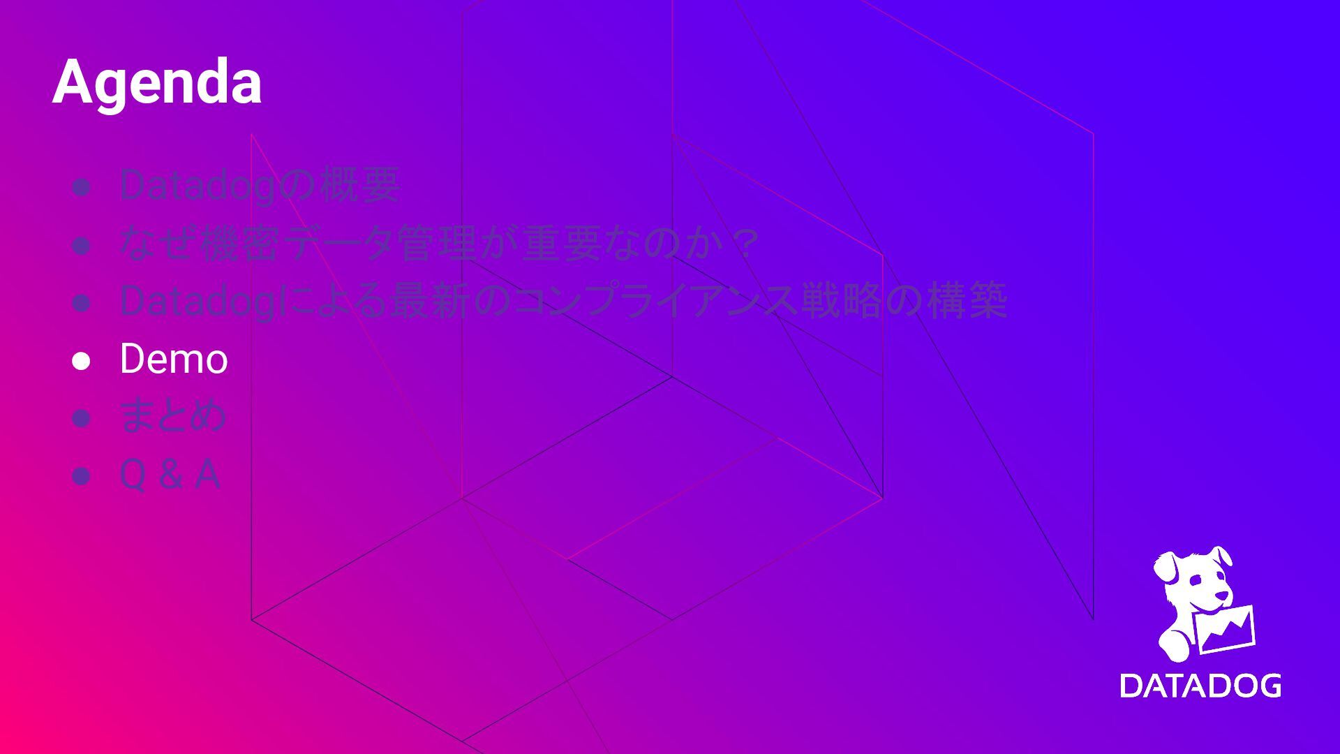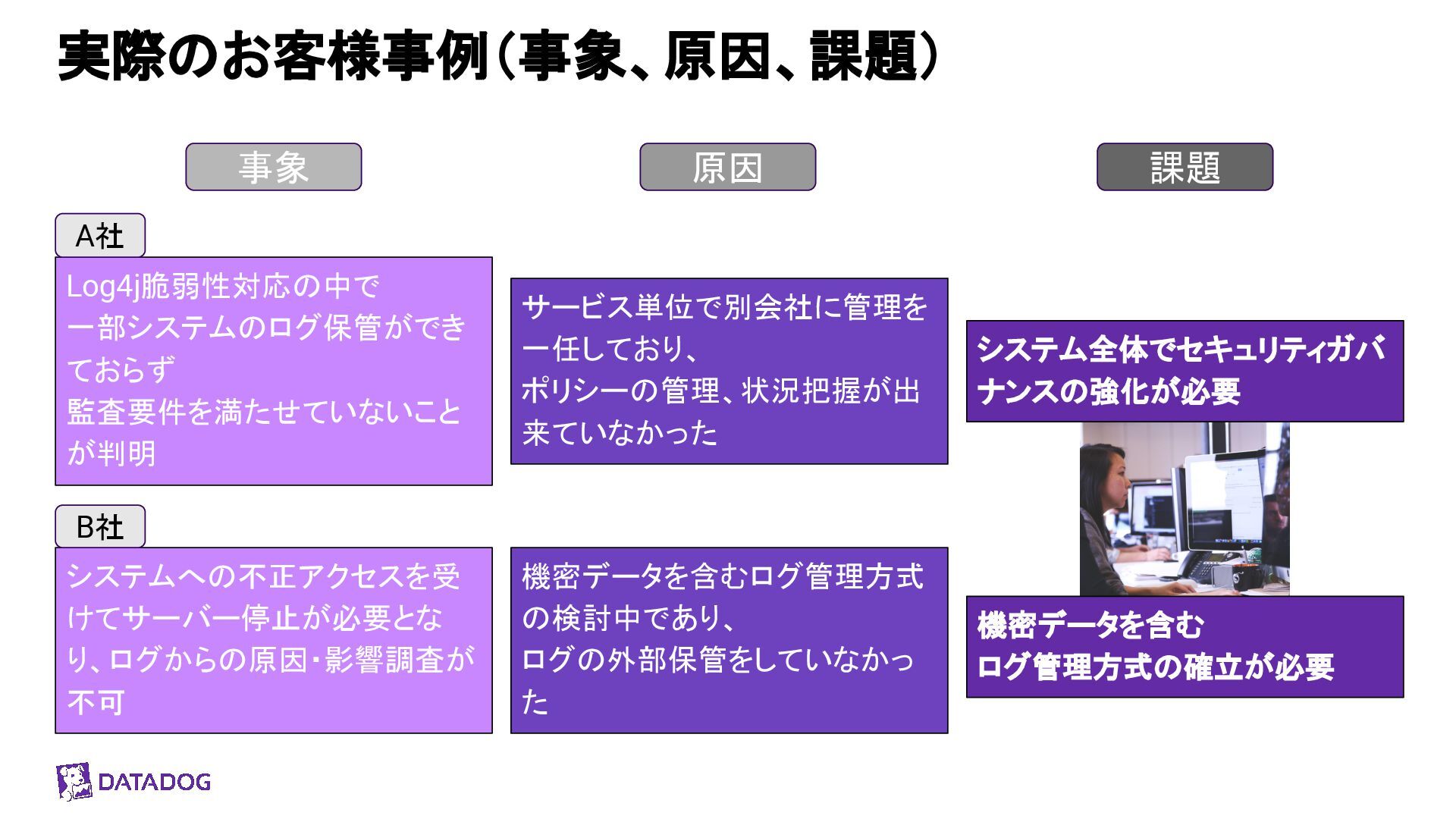 アクセス制御 SIEM CSPM CWS ASM Transport Layer Security HTTP Strict Transport Security Private Link Sensitive Data Scanner Role Based Access Control Datadog Audit Trail Datadog Agent Observability Pipelines API 本日は Logに焦 点を当て てご紹介