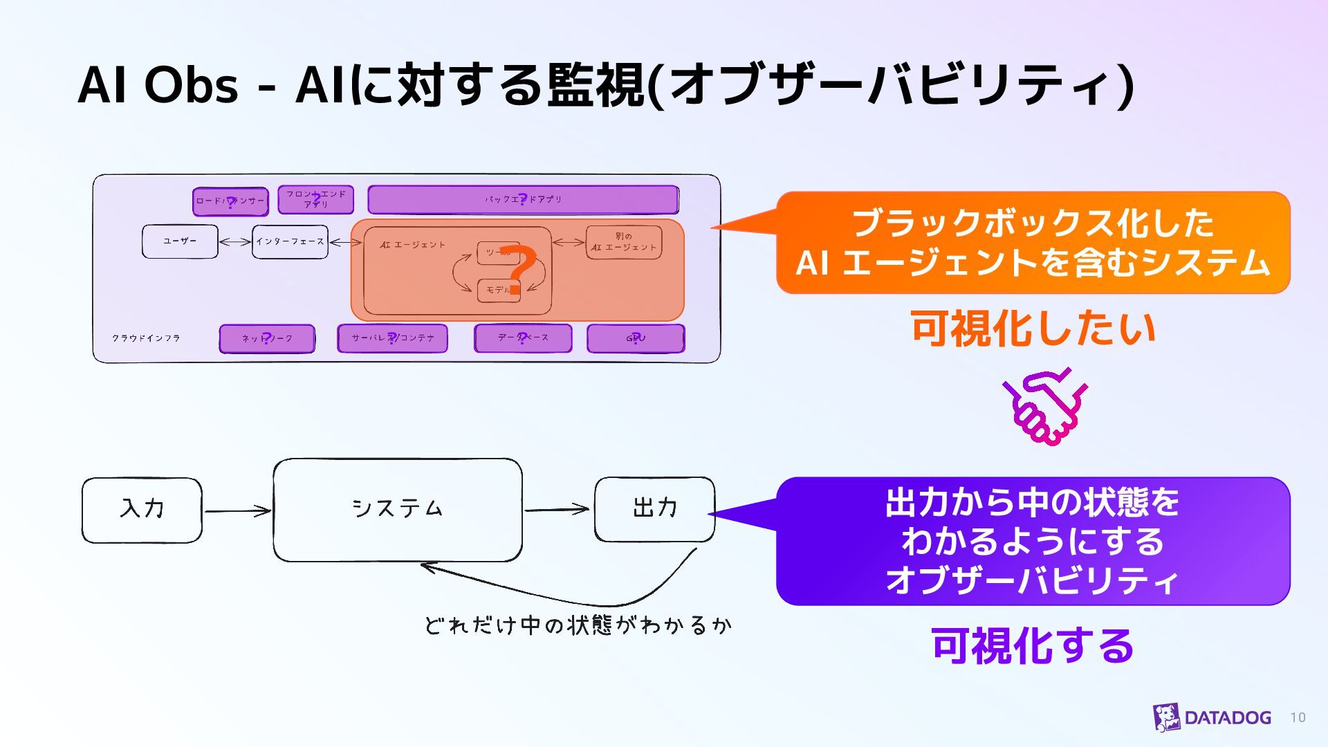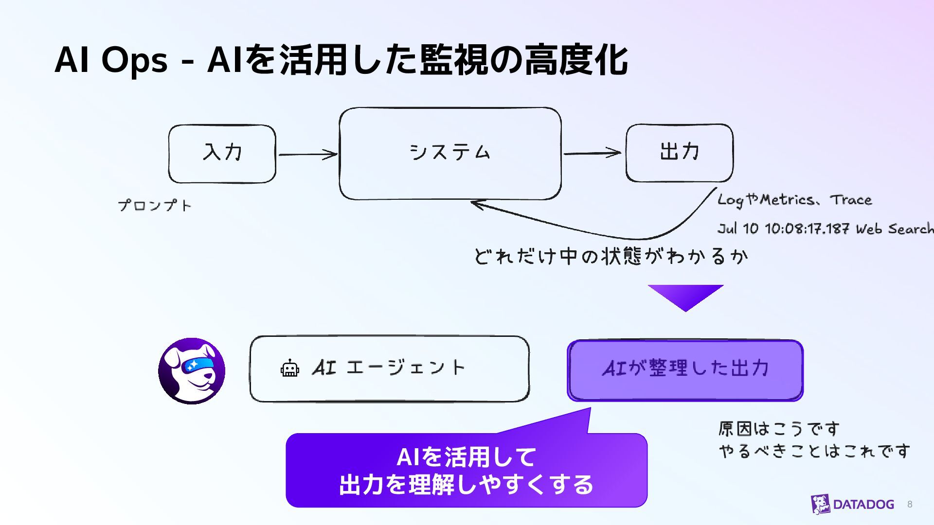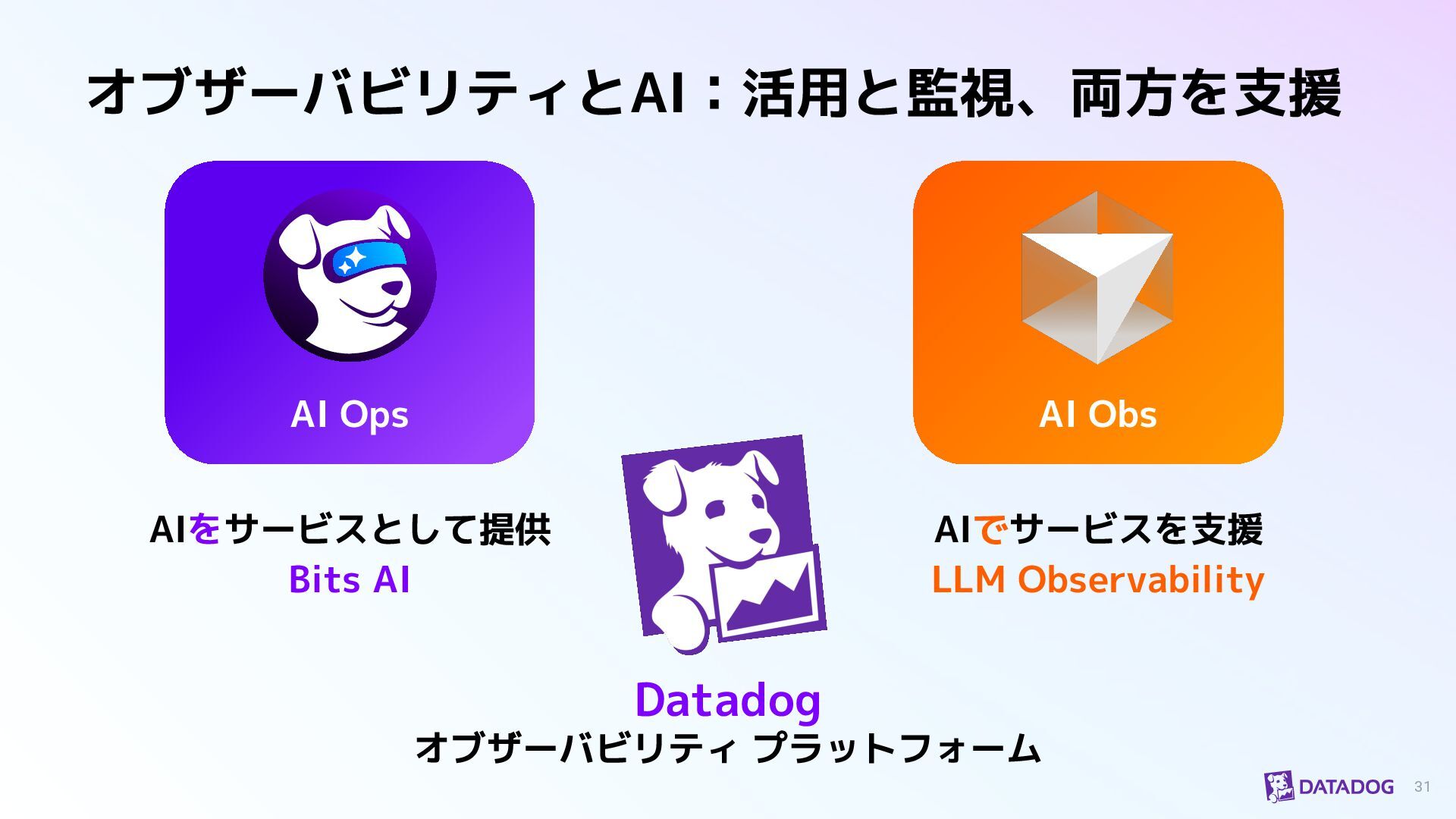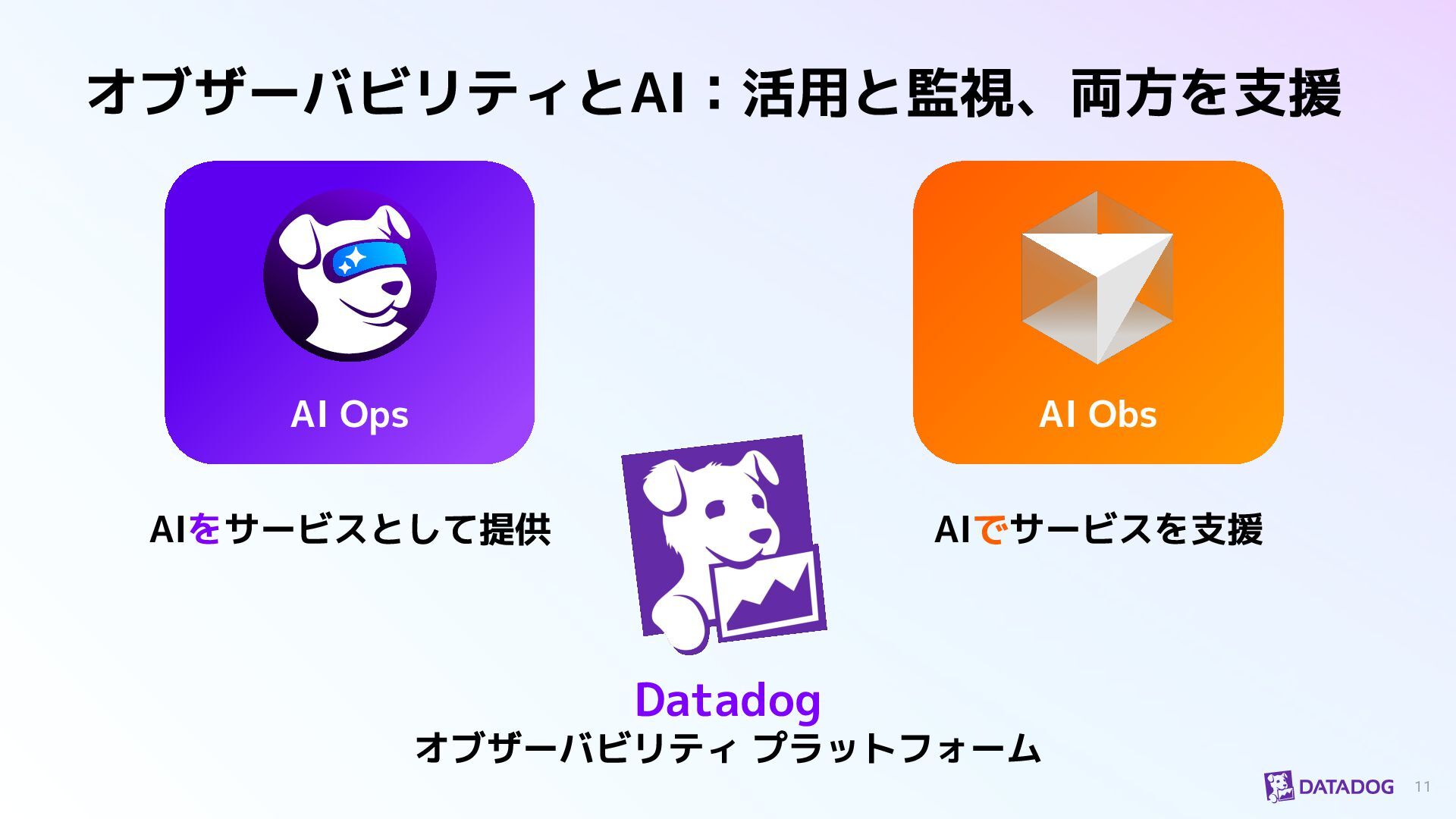 Datadogは「AIで監視する」AI Opsと、「AIを監視する」AI Obsという二つの側面から、AI時代のオブザーバビリティを支援します。