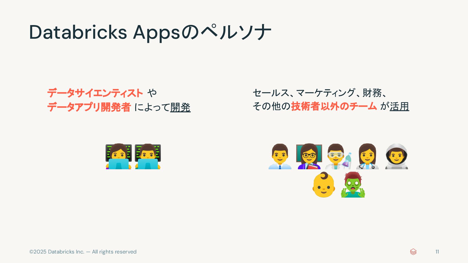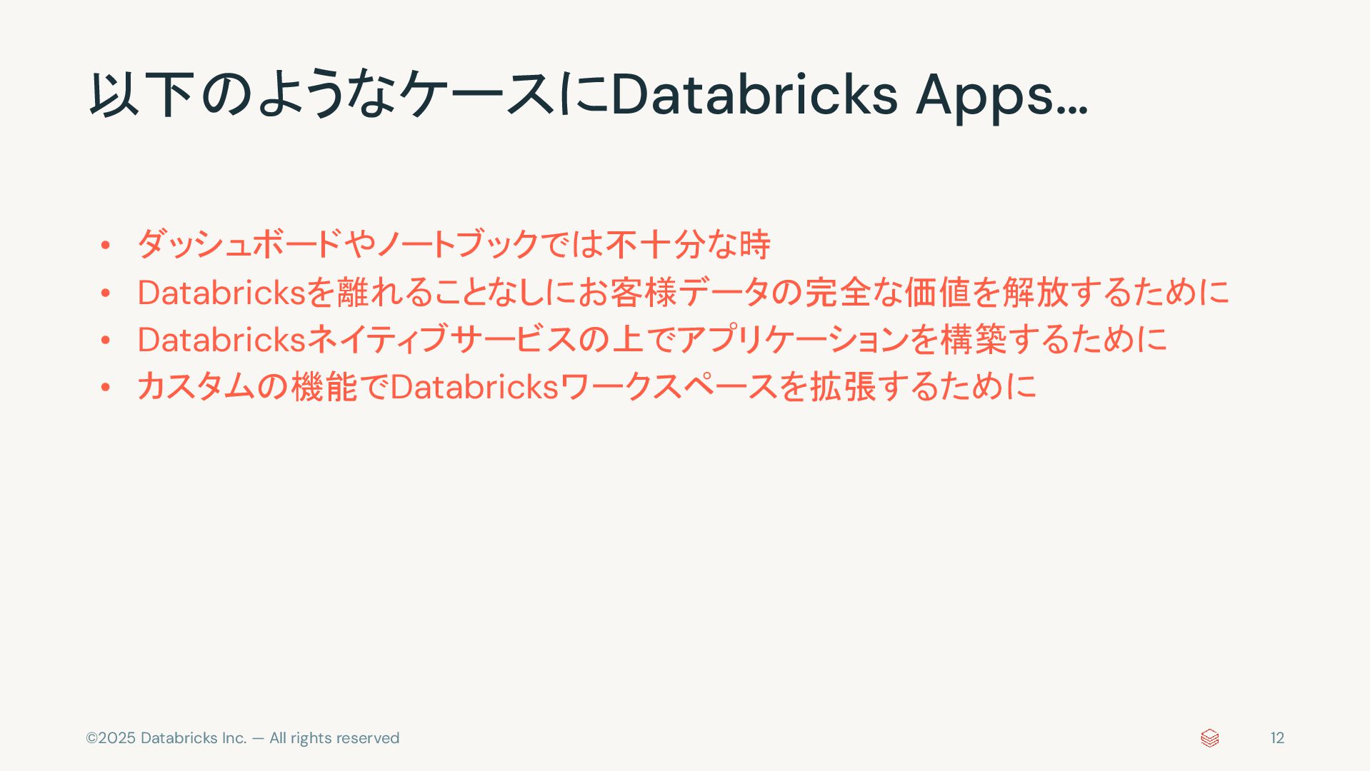 によって開発 セールス、マーケティング、財務、 その他の技術者以外のチーム が活用 11 Databricks Appsのペルソナ 👶