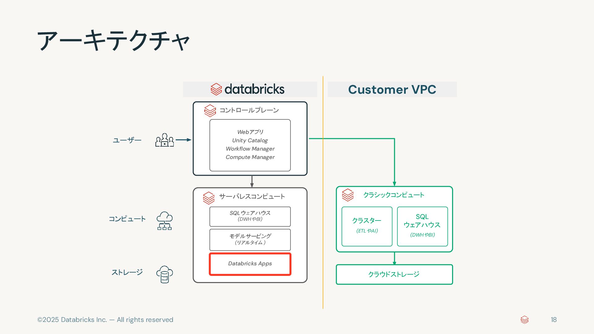 コントロールプレーン クラシックコンピュート Customer VPC クラスター (ETLやAI) SQL ウェアハウス (DWHやBI) SQLウェアハウス (DWHやBI) Webアプリ Unity Catalog Workflow Manager Compute Manager ユーザー コンピュート ストレージ クラウドストレージ モデルサービング (リアルタイム ) Databricks Apps