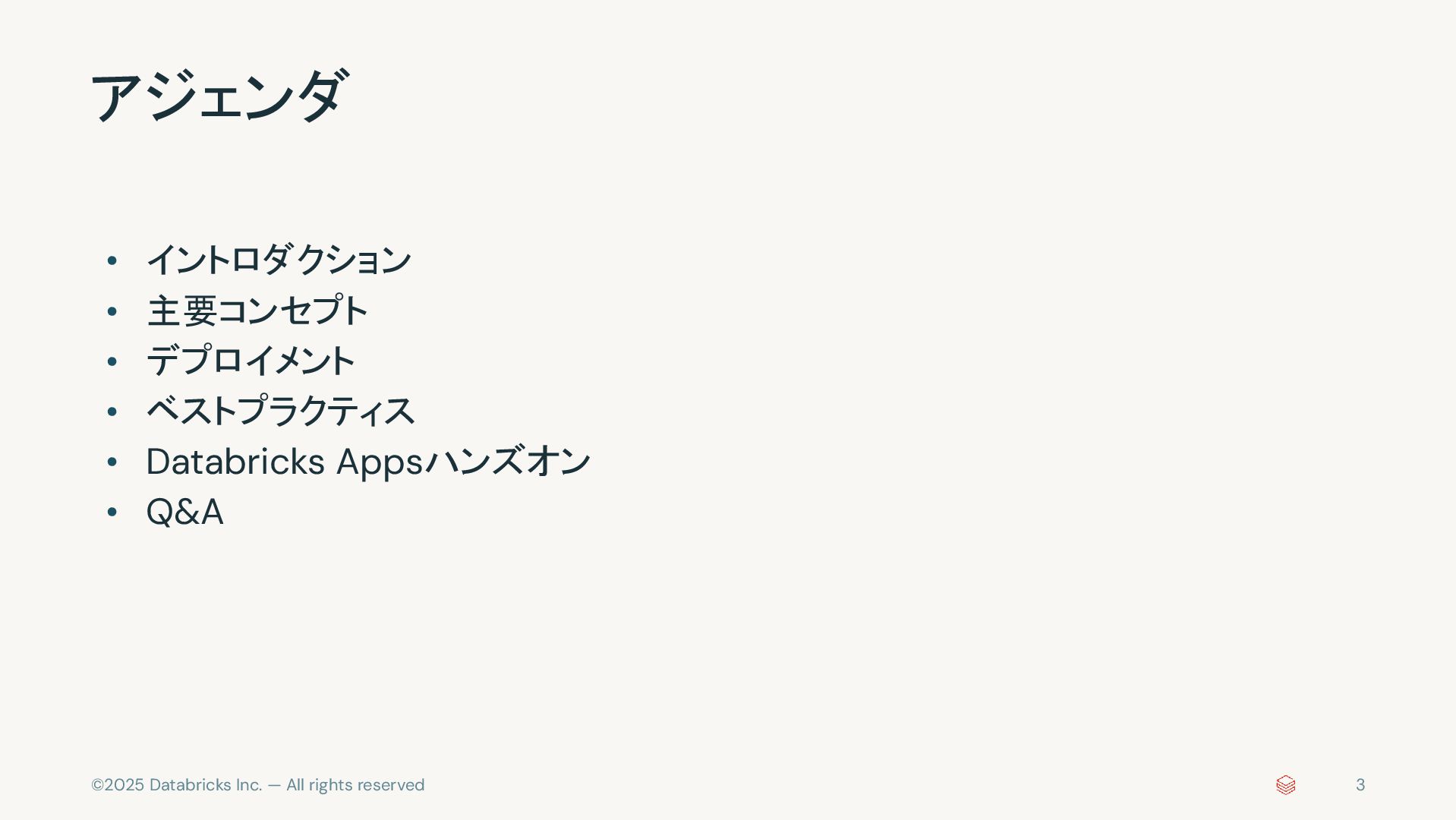 イントロダクション • 主要コンセプト • デプロイメント • ベストプラクティス • Databricks Appsハンズオン • Q&A