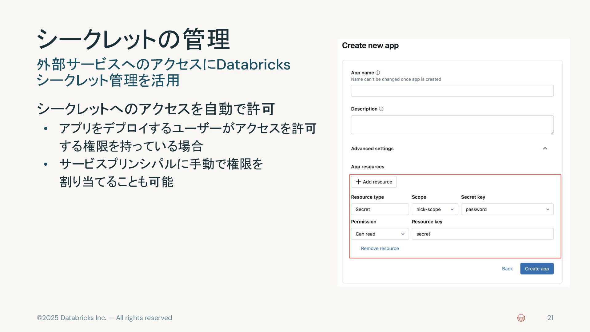 ©2025 Databricks Inc. — All rights reserved シークレットの管理 シークレットへのアクセスを自動で許可 •