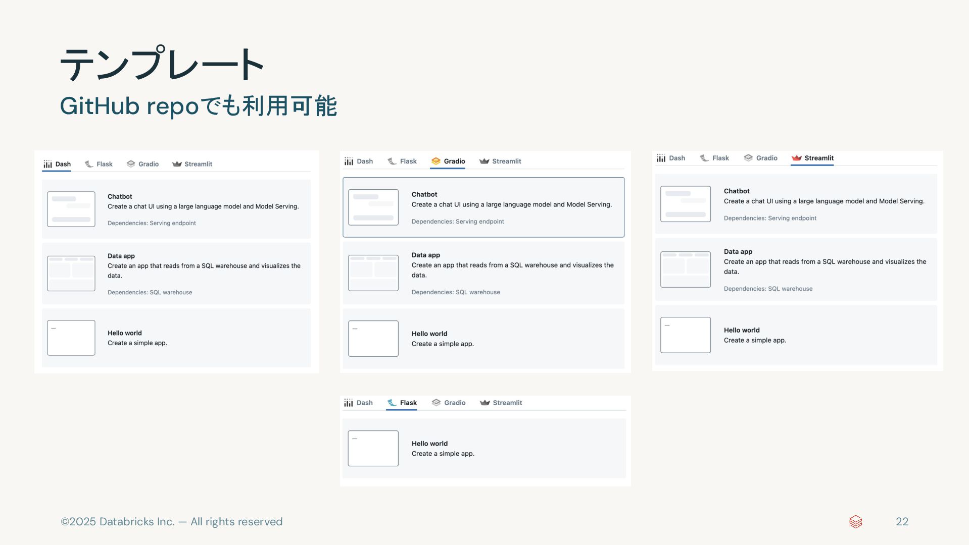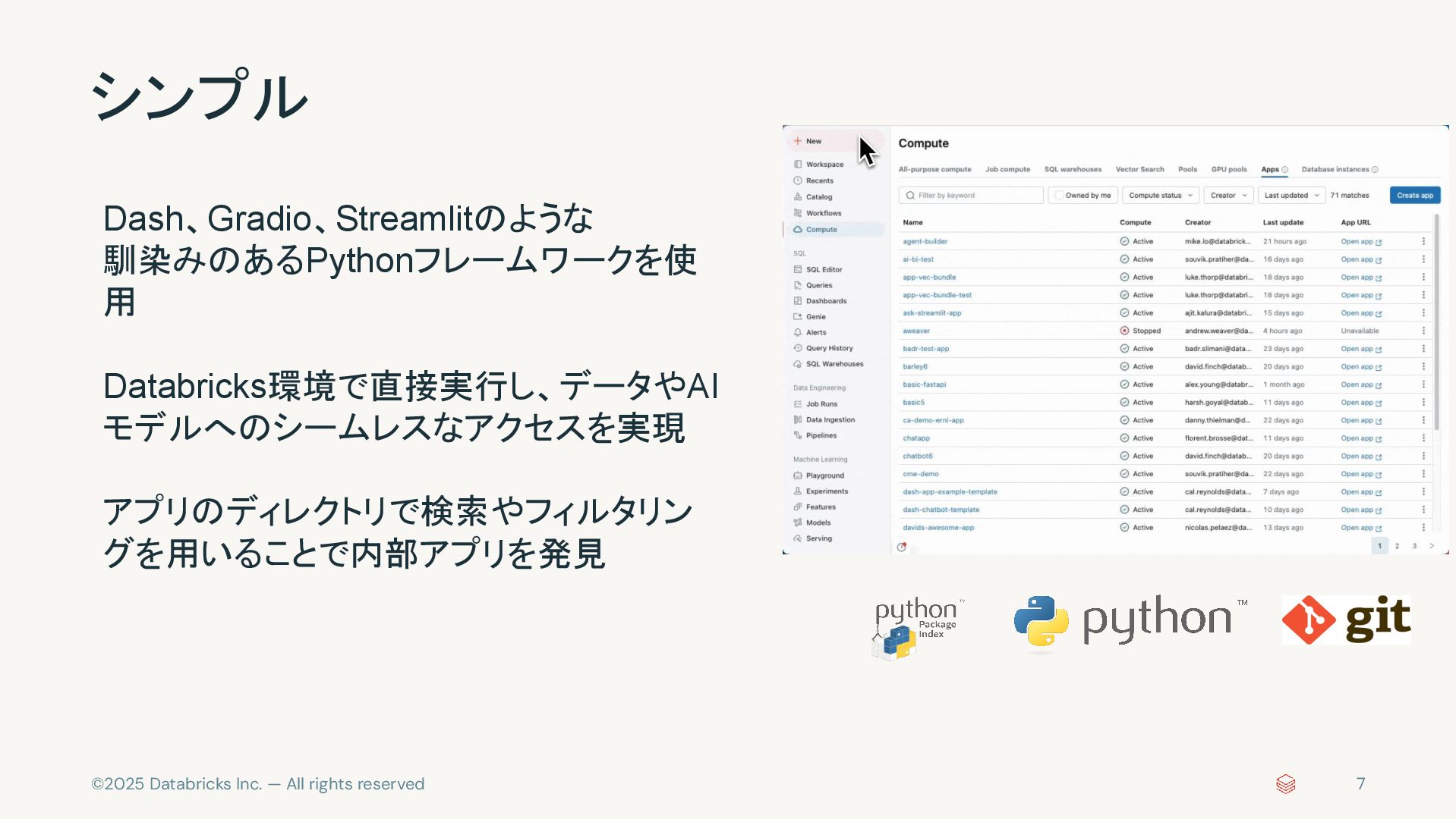©2025 Databricks Inc. — All rights reserved Dash、Gradio、Streamlitのような 馴染みのあるPythonフレームワークを使 用