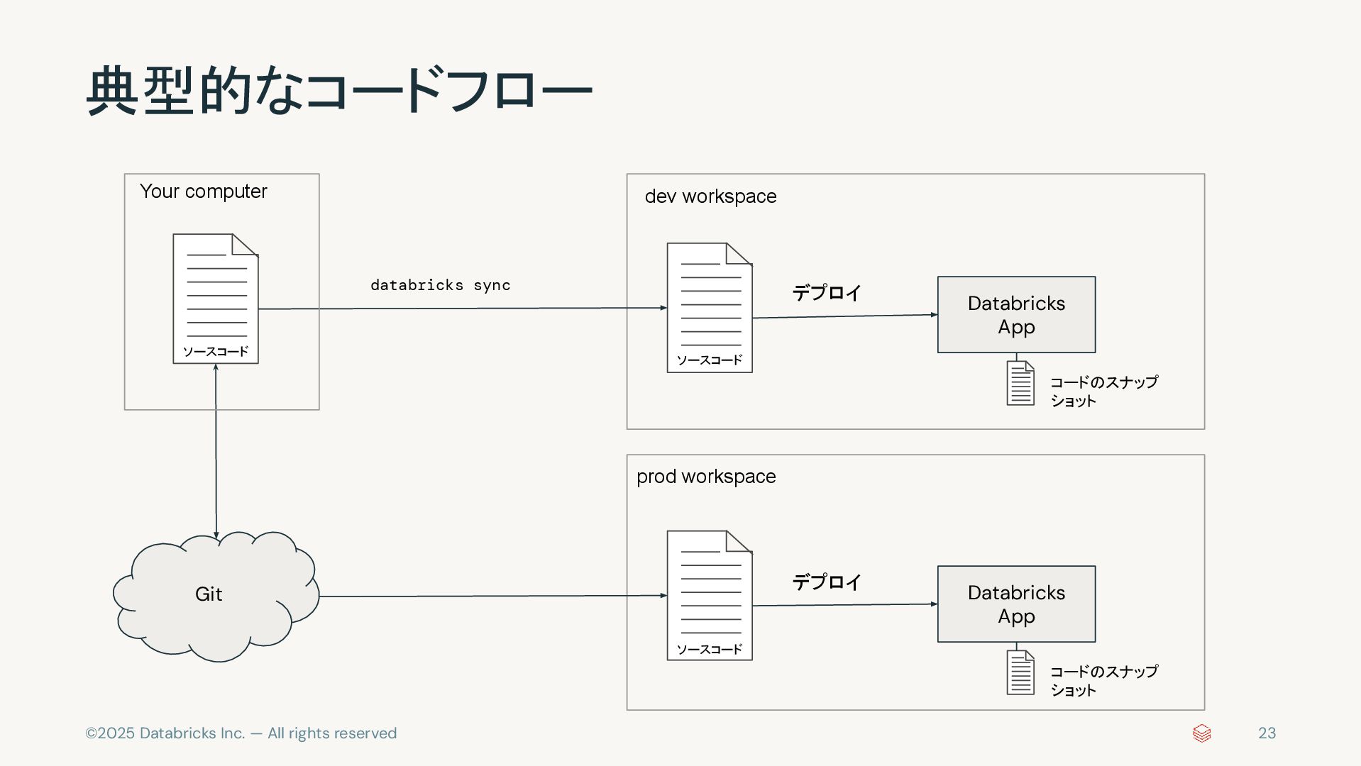 computer dev workspace Databricks App Git prod workspace Databricks App ソースコード ソースコード ソースコード デプロイ databricks sync デプロイ コードのスナップ ショット コードのスナップ ショット