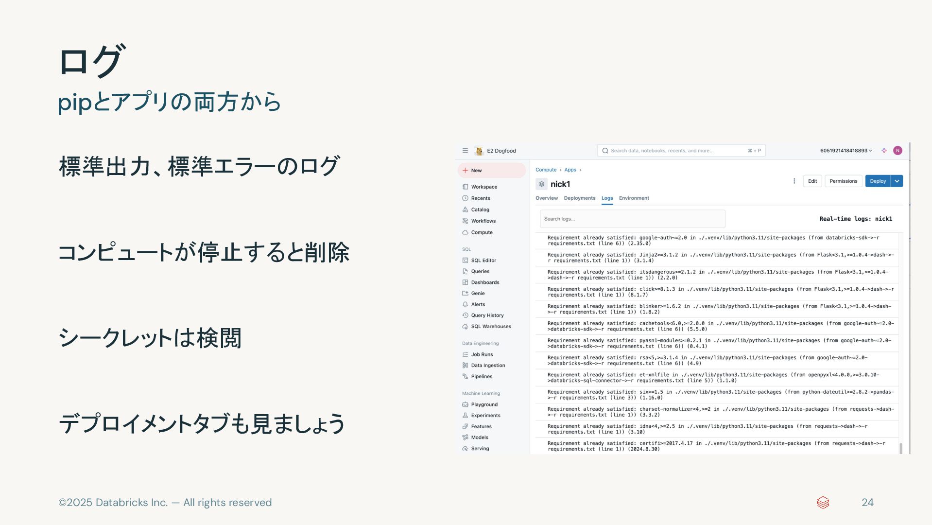 ©2025 Databricks Inc. — All rights reserved ログ 標準出力、標準エラーのログ コンピュートが停止すると削除
