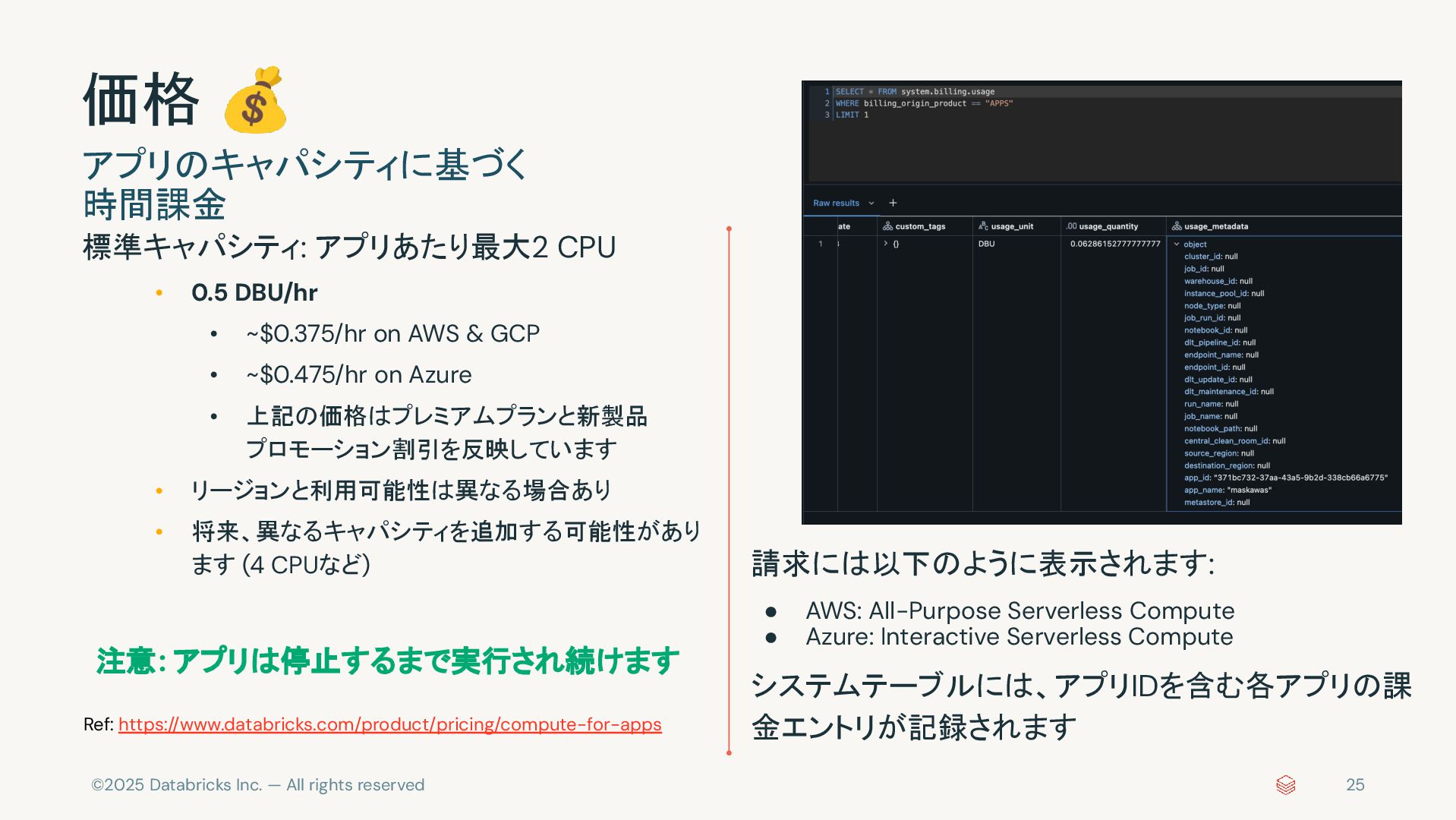 標準キャパシティ: アプリあたり最大2 CPU • 0.5 DBU/hr • ~$0.375/hr on AWS & GCP • ~$0.475/hr on Azure • 上記の価格はプレミアムプランと新製品 プロモーション割引を反映しています • リージョンと利用可能性は異なる場合あり • 将来、異なるキャパシティを追加する可能性があり ます (4 CPUなど) 注意: アプリは停止するまで実行され続けます アプリのキャパシティに基づく 時間課金 請求には以下のように表示されます: • AWS: All-Purpose Serverless Compute • Azure: Interactive Serverless Compute システムテーブルには、アプリIDを含む各アプリの課 金エントリが記録されます Ref: https://www.databricks.com/product/pricing/compute-for-apps