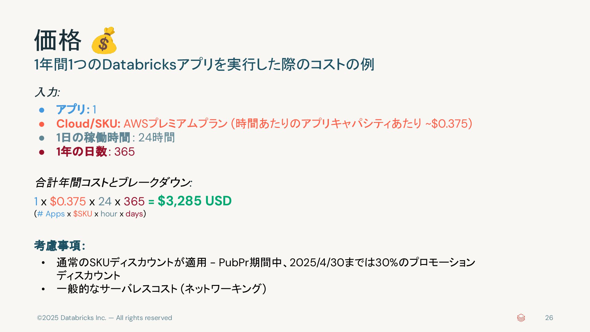 入力: • アプリ: 1 • Cloud/SKU: AWSプレミアムプラン (時間あたりのアプリキャパシティあたり ~$0.375) • 1日の稼働時間 : 24時間 • 1年の日数: 365 合計年間コストとブレークダウン: 1 x $0.375 x 24 x 365 = $3,285 USD (# Apps x $SKU x hour x days) 考慮事項: • 通常のSKUディスカウントが適用 - PubPr期間中、2025/4/30までは30%のプロモーション ディスカウント • 一般的なサーバレスコスト (ネットワーキング) 1年間1つのDatabricksアプリを実行した際のコストの例