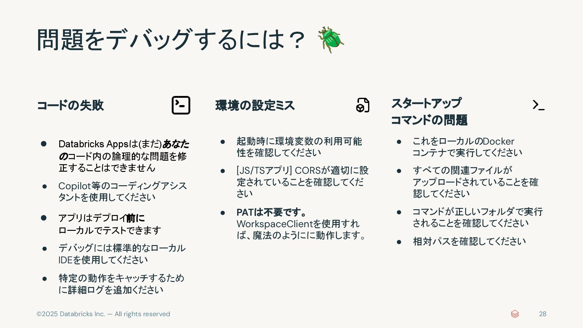 • Databricks Appsは(まだ)あなた のコード内の論理的な問題を修 正することはできません • Copilot等のコーディングアシス タントを使用してください • アプリはデプロイ前に ローカルでテストできます • デバッグには標準的なローカル IDEを使用してください • 特定の動作をキャッチするため に詳細ログを追加ください • 起動時に環境変数の利用可能 性を確認してください • [JS/TSアプリ] CORSが適切に設 定されていることを確認してくだ さい • PATは不要です。 WorkspaceClientを使用すれ ば、魔法のようにに動作します。 • これをローカルのDocker コンテナで実行してください • すべての関連ファイルが アップロードされていることを確 認してください • コマンドが正しいフォルダで実行 されることを確認してください • 相対パスを確認してください コードの失敗 環境の設定ミス スタートアップ コマンドの問題