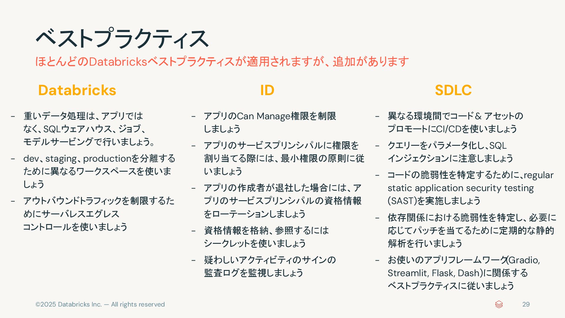 アセットの プロモートにCI/CDを使いましょう - クエリーをパラメータ化し、SQL インジェクションに注意しましょう - コードの脆弱性を特定するために、 regular static application security testing (SAST)を実施しましょう - 依存関係における脆弱性を特定し、必要に 応じてパッチを当てるために定期的な静的 解析を行いましょう - お使いのアプリフレームワーク(Gradio, Streamlit, Flask, Dash)に関係する ベストプラクティスに従いましょう ベストプラクティス - アプリのCan Manage権限を制限 しましょう - アプリのサービスプリンシパルに権限を 割り当てる際には、最小権限の原則に従 いましょう - アプリの作成者が退社した場合には、ア プリのサービスプリンシパルの資格情報 をローテーションしましょう - 資格情報を格納、参照するには シークレットを使いましょう - 疑わしいアクティビティのサインの 監査ログを監視しましょう SDLC ID - 重いデータ処理は、アプリでは なく、SQLウェアハウス、ジョブ、 モデルサービングで行いましょう。 - dev、staging、productionを分離する ために異なるワークスペースを使いま しょう - アウトバウンドトラフィックを制限するた めにサーバレスエグレス コントロールを使いましょう Databricks ほとんどのDatabricksベストプラクティスが適用されますが、追加があります 29