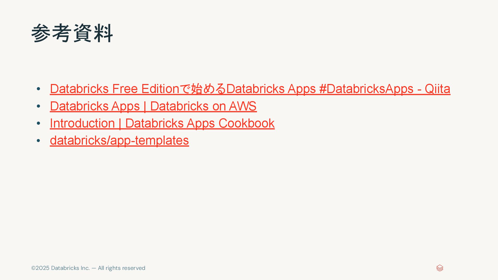 Free Editionで始めるDatabricks Apps #DatabricksApps - Qiita • Databricks Apps | Databricks on AWS • Introduction | Databricks Apps Cookbook • databricks/app-templates