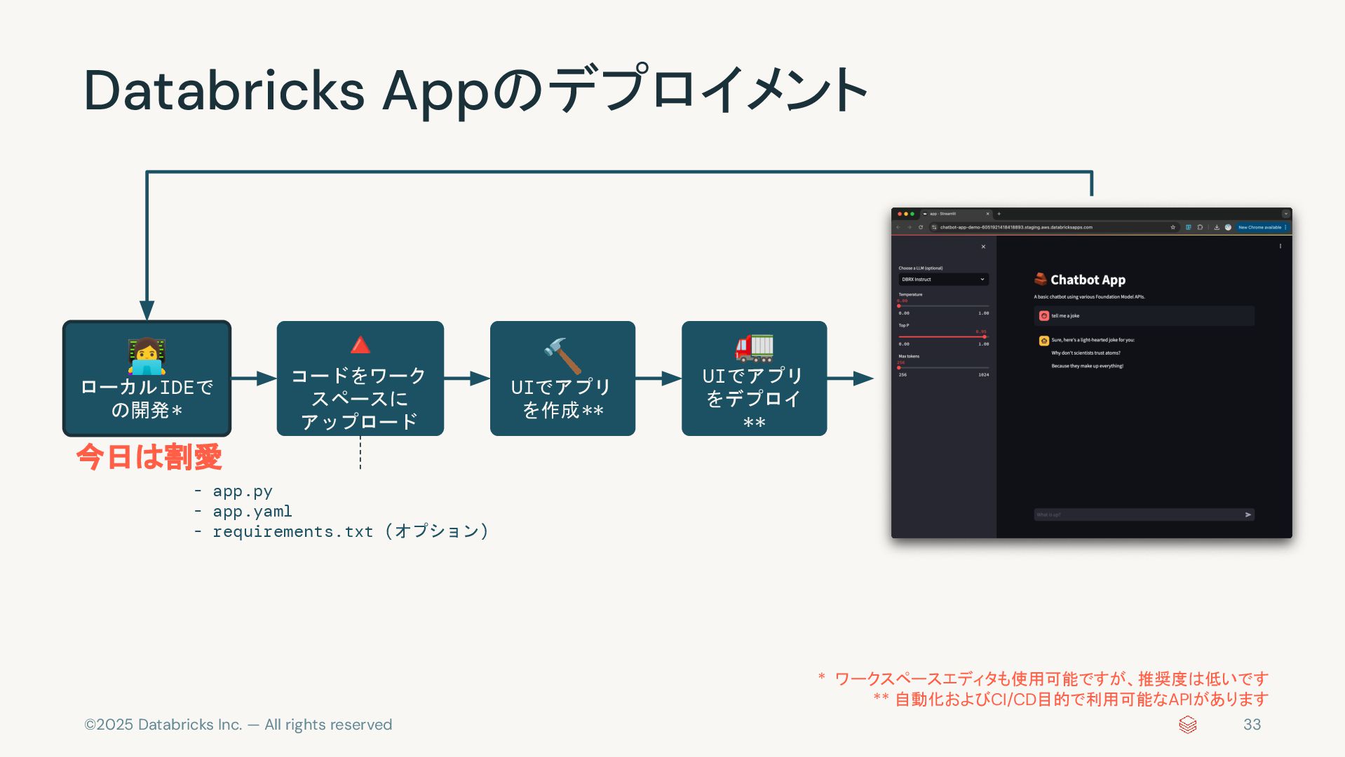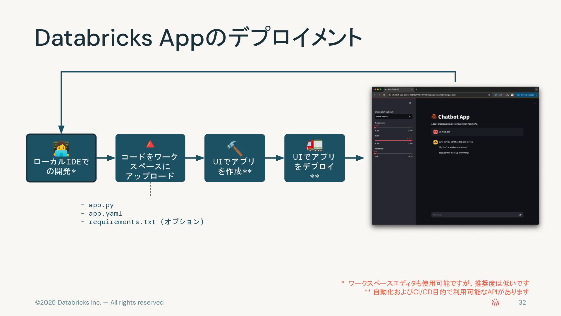 ローカルIDEで の開発* 🔺 コードをワーク スペースに アップロード - app.py - app.yaml - requirements.txt (オプション) 🔨 UIでアプリ を作成** 🚛 UIでアプリ をデプロイ ** * ワークスペースエディタも使用可能ですが、推奨度は低いです ** 自動化およびCI/CD目的で利用可能なAPIがあります