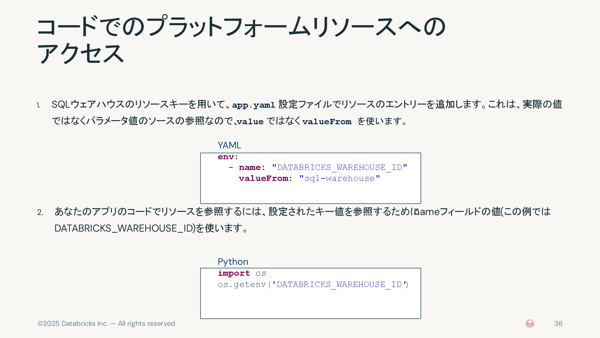 SQLウェアハウスのリソースキーを用いて、 app.yaml 設定ファイルでリソースのエントリーを追加します。これは、実際の値 ではなくパラメータ値のソースの参照なので、 value ではなく valueFrom を使います。 YAML env: - name: "DATABRICKS_WAREHOUSE_ID" valueFrom: "sql-warehouse" 2. あなたのアプリのコードでリソースを参照するには、設定されたキー値を参照するために nameフィールドの値(この例では DATABRICKS_WAREHOUSE_ID)を使います。 Python import os os.getenv('DATABRICKS_WAREHOUSE_ID' ) 36