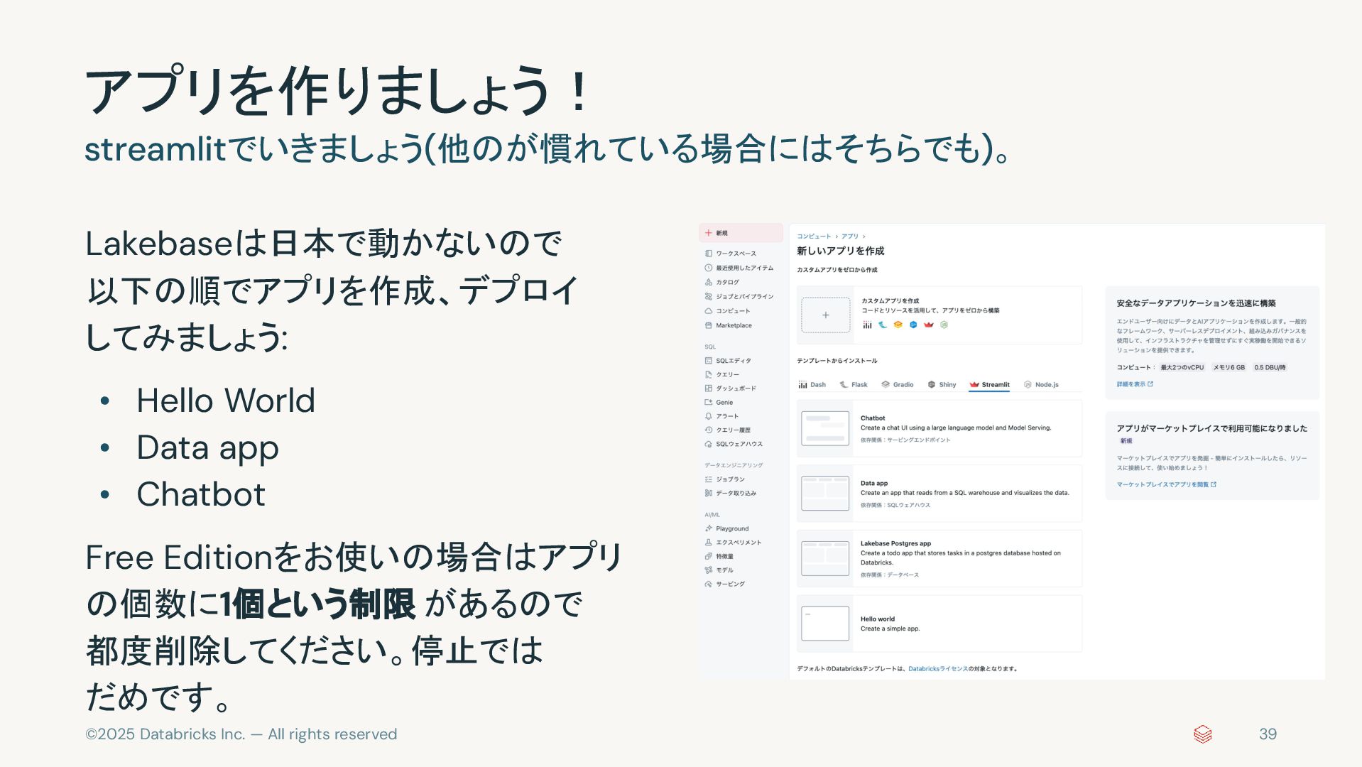 以下の順でアプリを作成、デプロイ してみましょう: • Hello World • Data app • Chatbot Free Editionをお使いの場合はアプリ の個数に1個という制限 があるので 都度削除してください。停止では だめです。 streamlitでいきましょう(他のが慣れている場合にはそちらでも)。