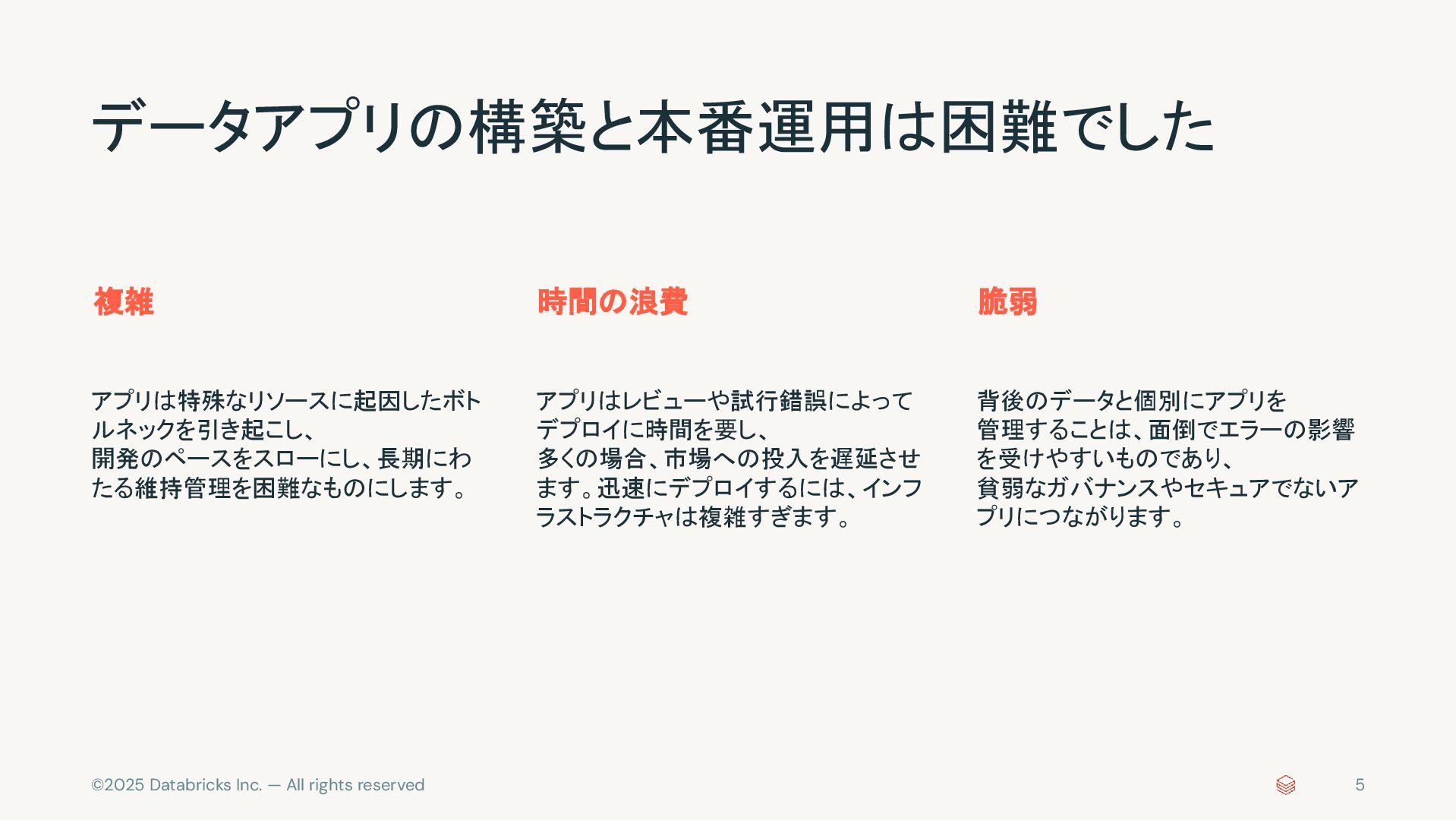 ©2025 Databricks Inc. — All rights reserved アプリは特殊なリソースに起因したボト ルネックを引き起こし、 開発のペースをスローにし、長期にわ
