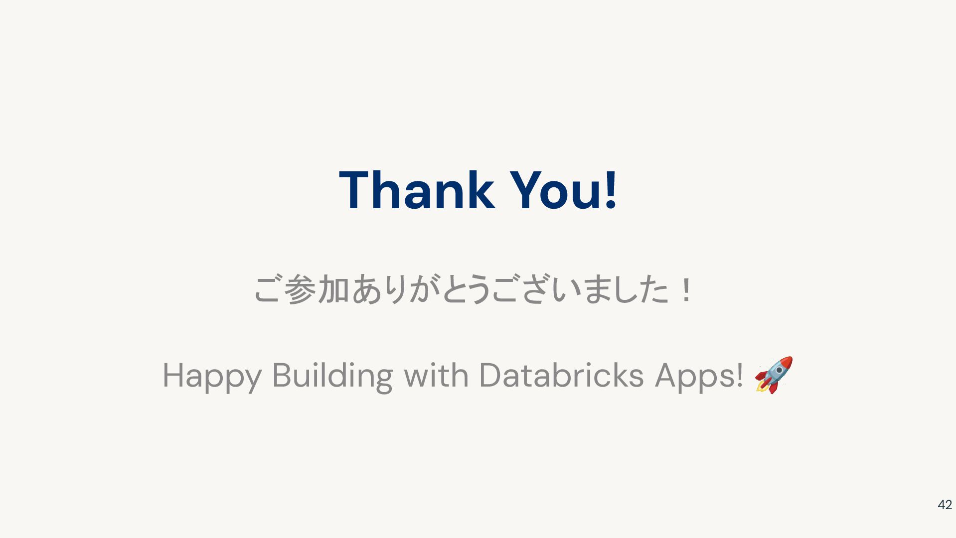 42 Thank You! ご参加ありがとうございました! Happy Building with Databricks Apps! 🚀