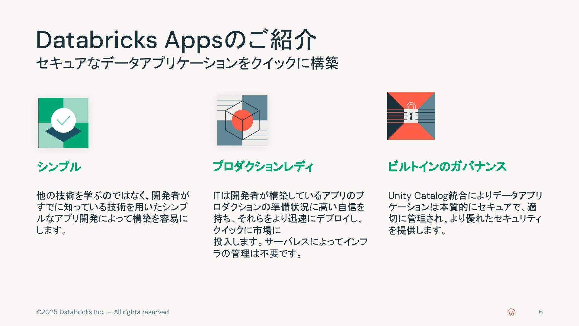 します。 6 Databricks Appsのご紹介 ITは開発者が構築しているアプリのプ ロダクションの準備状況に高い自信を 持ち、それらをより迅速にデプロイし、 クイックに市場に 投入します。サーバレスによってインフ ラの管理は不要です。 シンプル プロダクションレディ Unity Catalog統合によりデータアプリ ケーションは本質的にセキュアで、適 切に管理され、より優れたセキュリティ を提供します。 ビルトインのガバナンス セキュアなデータアプリケーションをクイックに構築